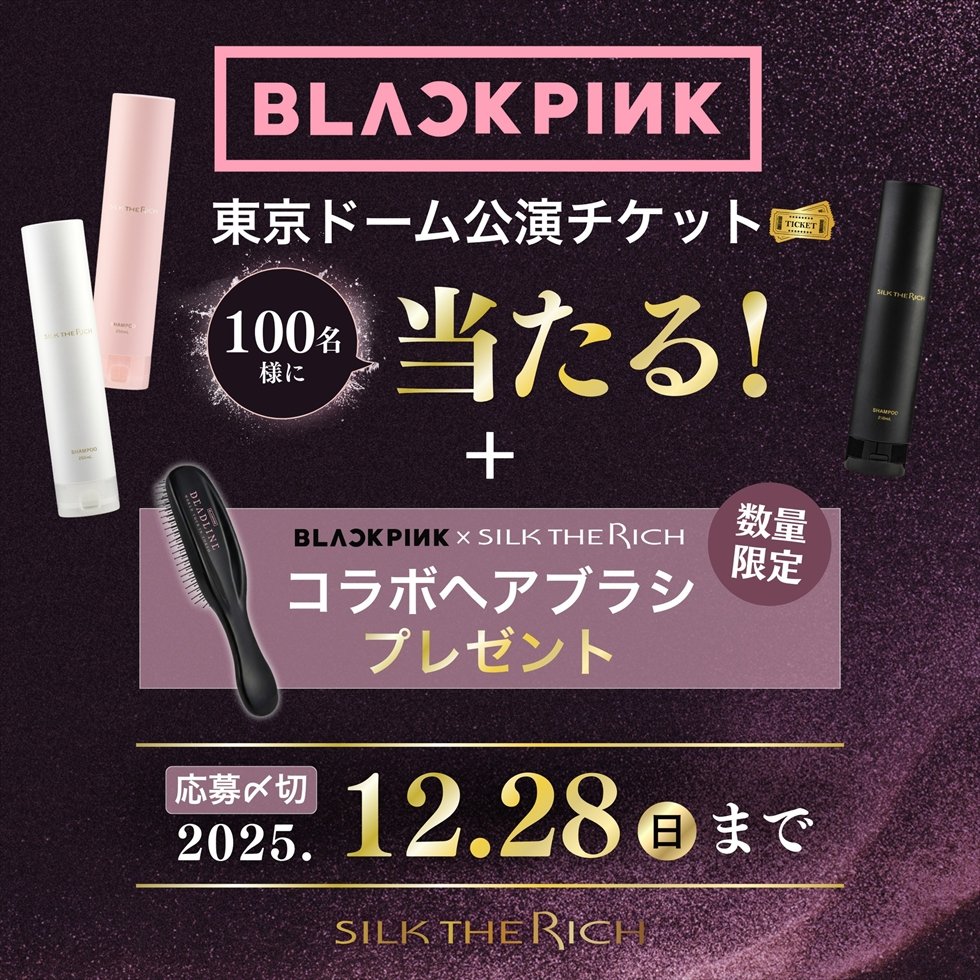 今回のスポンサー就任を記念し、対象製品「SILK THE RICH」3点セット(シャンプー・トリートメント・ヘアオイル)を定期購入した方限定100名様に、BLACKPINK WORLD TOUR <DEADLINE> IN TOKYOのチケットが当たるキャンペーンを、2025年12月9日(火)~12月28日(日)の期間限定で実施する。なお、3ヶ月おまとめ便で購入の場合、チケット当選確率2倍となる。