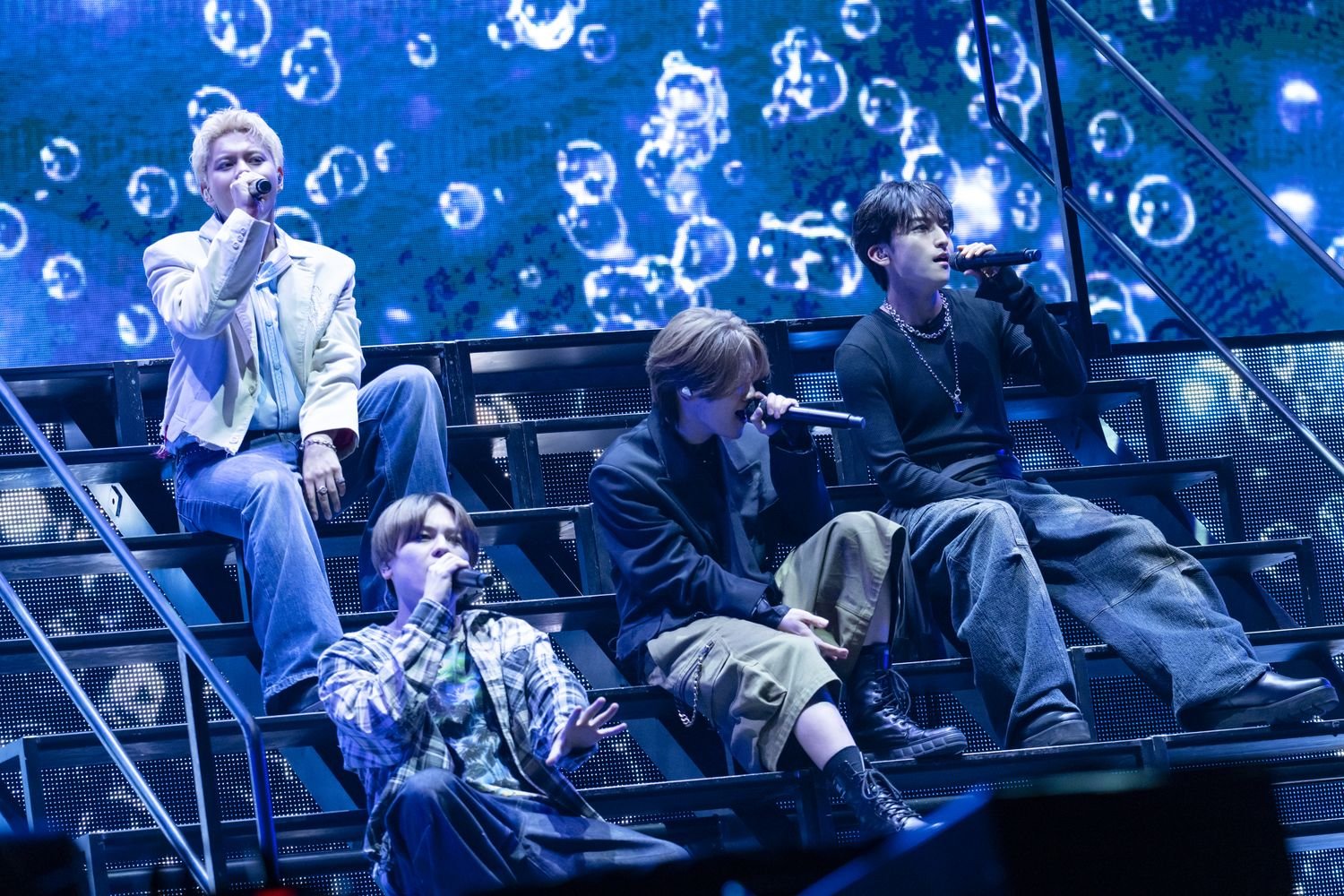 Aile The ShotaとKAIRYUに続き、REIKOとJUNONによる「First Christmas」が披露され、珠玉の歌のブロックに突入。REIKOが「JUNONくん、めちゃくちゃ早めのメリークリスマス!」と言えば、JUNONが「この会場全員をクリスマスの気分にさせてやりますよ」と意気込み、美しいハーモニーを聴かせた。低いビートが響き、何が始まるかと思ったら、MANATOの伸びやかな歌から、MANATO、KAIRYU、REIKO、KANONによるR&Bの新曲「BUBBLE」が披露された。4人は座りながら、深い影を宿した切ないバラードをしっとりと歌い上げた。この4人でR&Bを歌って欲しいと願っていた人は多いだろう。そんな願望が最高の形で叶えられるのも音楽集団BMSGならでは。