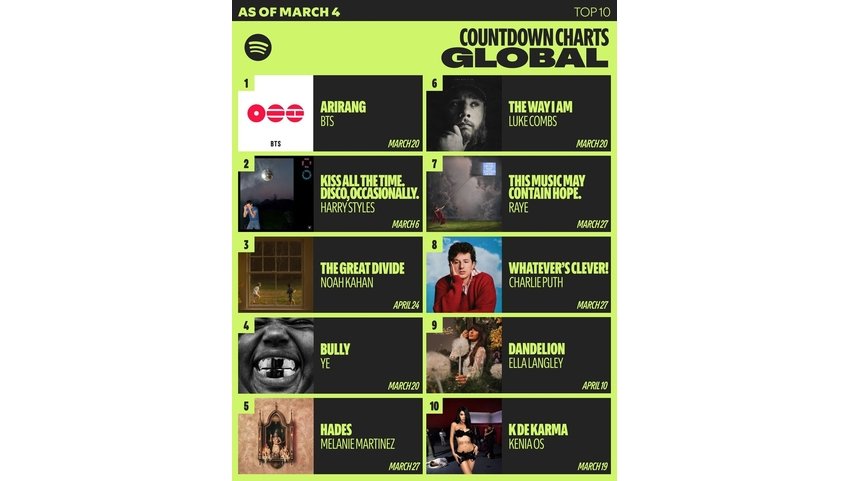 BTS 'ARIRANG'、Spotify「カウントダウンチャート・グローバル」で5週連続首位を獲得!