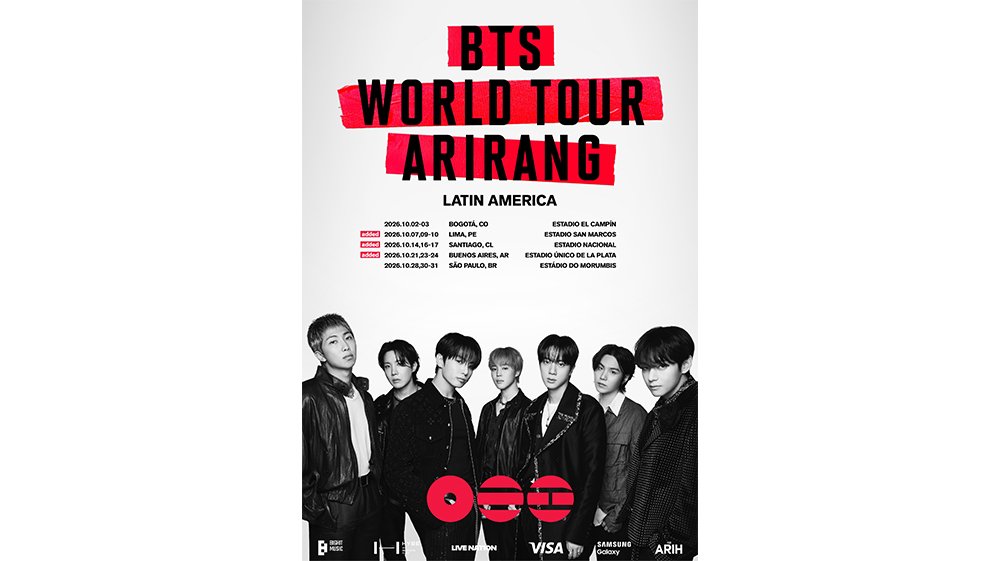 BTSは8日午前、Global Superfan Platform「Weverse」の告知を通じて、10月に開催される南米ツアーのうち、ペルー・リマ、チリ・サンティアゴ、アルゼンチン・ブエノスアイレス公演をそれぞれ1公演ずつ追加すると発表した。これにより『BTS WORLD TOUR ‘ARIRANG’』は、計34都市・全85公演にわたり開催される。