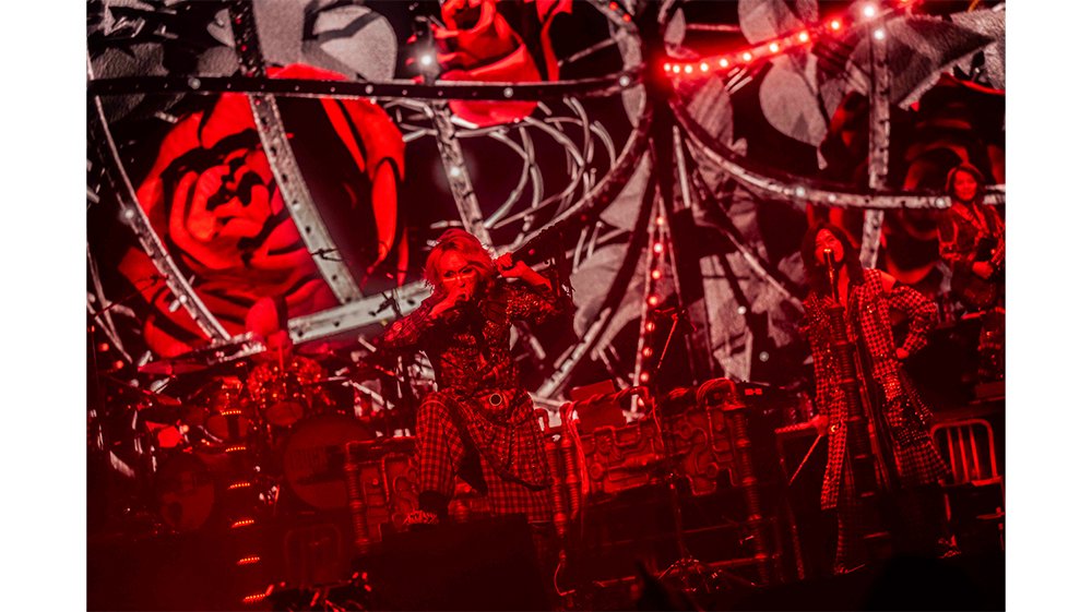インダストリアルなノイズ音に、ひそひそと何かを企むような囁き声。そんなSEが響く中、メンバーが登場すると、ステージ前方に下がっていたスチール製の大きな薔薇のモチーフが天井へとせり上がる。この先、一度も降りてくることなく掲げられたままの大きな薔薇の下で、〈-ナイショの薔薇の下-〉公演が幕を開けたのである。