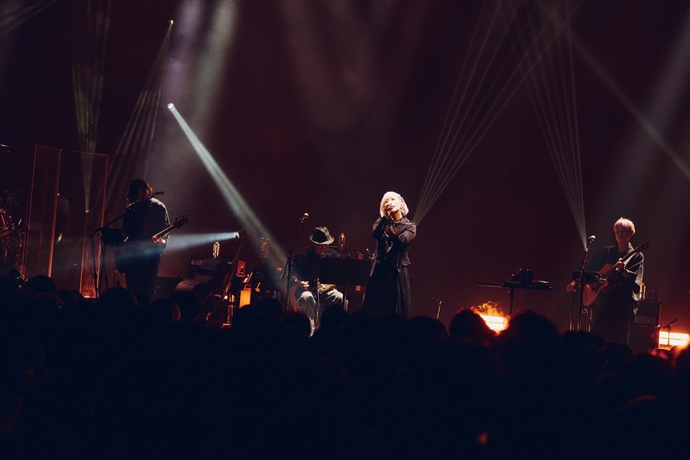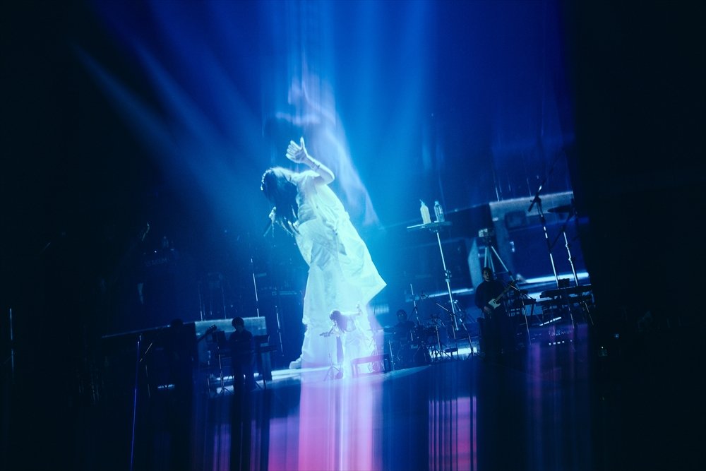 メインステージにまず登場したのは、その鋭利な言語感覚や独創的な表現手法によって、ジャンルを超えて多大な影響を与え続けるロックバンド、amazarashi。これまでメディアなどに素顔を明かしていない彼らだが、この日も紗幕に映し出される映像やタイポグラフィ、さらにハイクオリティな照明演出によってバンドの姿はシルエットでしか見えず、表情も見えない。しかしそれでも、剥き出しの生活感情や肉体感を刻んだ言葉とバンドサウンドは極めて生々しく、直接的に、その「存在」を目の前に差し出してくるようだ。家族への思いを歌う新曲“クラウン新車で買ってあげる”も披露される貴重なライブとなった。