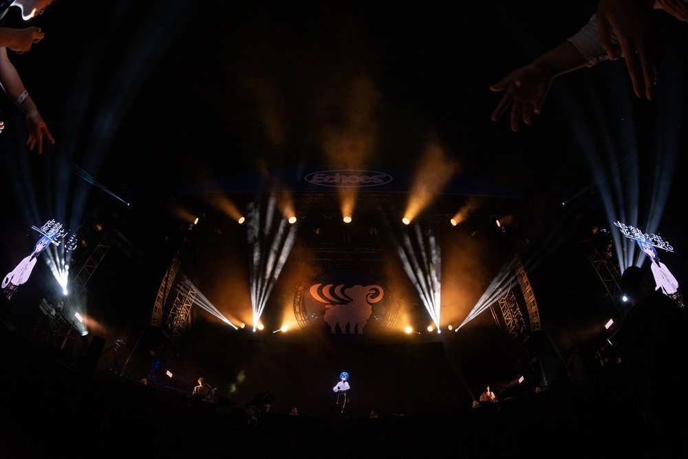 横浜港に花火が上がり、オーディエンスの期待も大いに高まったところで登場した大トリは、バーチャルアイドル・星街すいせい。「プリマドンナ」で始まったライブのステージ上にあるのは、生演奏するバンドの影とステージ中央で熱唱する星街の姿。星街の圧倒的な歌唱力に、フィールドから大きな歓声が上がる。「すいちゃんは?」「今日もかわいい〜!」のコールで気持ちをひとつにすると、「みちづれ」「AWAKE」と続き、オーディエンスのボルテージは最高潮。ライブ終盤は「Stellar Stellar」、ツミキを迎えての「ビビデバ」、「ソワレ」と人気曲を惜しげなく連投。熱狂するオーディエンスと共に壮大なクライマックスを作り上げ、派手やかに美しく「Echoes Baa」の幕を閉じた。