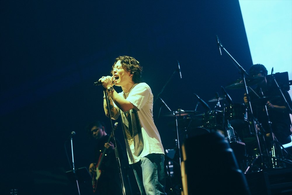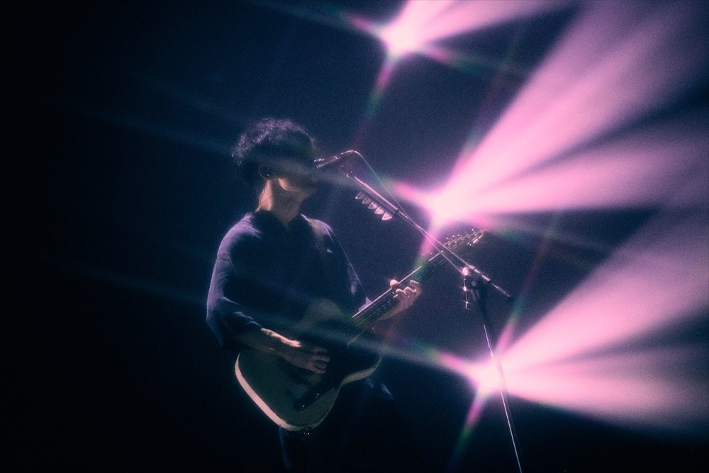 「Echoes Baa」初日。小雨がそぼ降るあいにくの天気ながら、開演を心待ちにするオーディエンスで埋め尽くされた会場に、オープニングアクトとして登場したのはjo0ji(ジョージ)。彼が初めて作った曲である「不屈に花」、TVアニメ「呪術迴戦」「死滅回游 前篇」EDテーマの「よあけのうた」を感情たっぷりに歌い上げて観客の心をしっかり温め、この日のライブは幕を開けた。