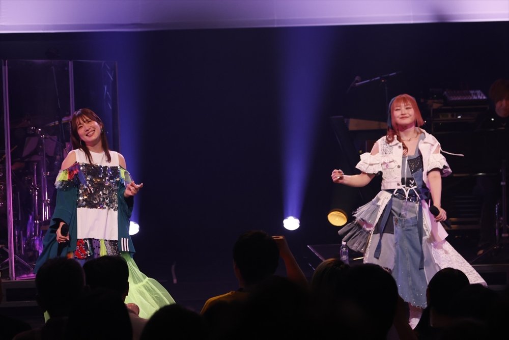 さらに、興奮冷めやらぬステージに内田を呼び込み、2人で披露したのはなんとレーベルメイトである三森すずこの楽曲「ユニバーページ」(TVアニメ「アウトブレイク・カンパニー」オープニングテーマ)だ。『P's TRIVAL』だから実現したコラボ&選曲、嬉しさたっぷりに紡がれる2人のハーモニーに、会場は大盛り上がりとなった。TVアニメ『魔都精兵のスレイブ』での共演やさまざまなステージを経験してきた2人だが、実は一緒に歌うのは初めて。MCでは、内田が立花のことを「格好良くて好き」と言って照れさせれば、逆に立花は内田のすごさやかわいさを熱弁していた。