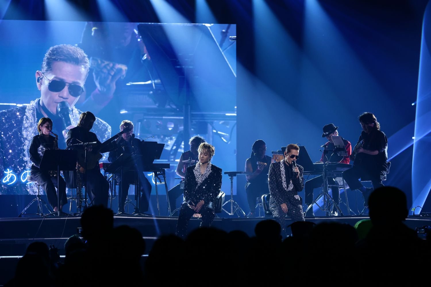 その後登場したATSUSHIとTAKAHIROがバンドメンバーとともにセンターステージへと移動すると、ここからは、名曲揃いのEXILEのウインターソングから5曲をアコースティックセットで披露し「LAST CHRISTMAS」から始まり、「HOLY NIGHT」、「あなたへ」「Heavenly White」、そして「I Believe」。繊細な楽器の音色と2人が丁寧に織りなす極上のハーモニーによって、愛した人を想う切なさも、若過ぎたあの冬の日の恋も、よりドラマチックに響いてくる。この季節ならではの特別感に加え、通常のツアーではなく、FCイベントだからこそ出来たコアな選曲に納得のバラードコーナーだった。