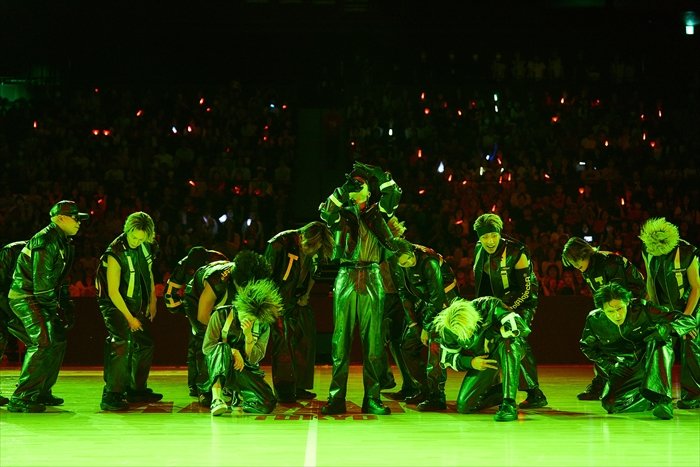 続いて登場したのは、THE RAMPAGE。スピード感溢れるエネルギッシュなダンスナンバー「16BOOSTERZ」でスタートとなった。ダンスブレイクや、横一列のシンクロダンスは圧巻。16人という大人数を活かし、コートを端から端まで最大限に使用していたのが印象的だった。続く「100degrees」のイントロが流れると歓声があがり、川村壱馬の「盛り上がっていこうぜ!」で会場はヒートアップ。途中のダンスブレイクでは、パフォーマー一人ひとりがソロダンスを披露し、それぞれの持ち味を見せつけていく。ラストには会場全体で両手を大きく上下に動かし、楽曲タイトルのどおり会場は熱気に包まれた。