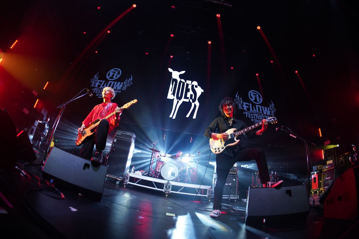 いきなりカウンターパンチを繰り出すようにアニメ『銀魂』の「曇天」のイントロを響かせたDOES。グルーブするビートと共に「ウォー!」と歓声があがり、フロアが揺れた。観客のクラップが軽やかなリズムと重なった「サブタレニアン・ベイビー・ブルース」に続いてアニメ『NARUTO-ナルト-疾風伝』のOP「紅蓮」が響く。唸るようなギターリフがフロアを駆け、謳うようなドラムとベースのリズムも勢いつけて会場を席捲すると、ライブは続く『劇場版 銀魂 新訳紅桜篇』ED「僕たちの季節」へ。焦燥感と哀愁とが同居するロックンロールナンバーに、思い思いに体を揺らすオーディエンスの姿があった。「オイ!オイ!」と日本と変わらない声に迎えられたオーセンティックなロックチューン「世界の果て」の後には、彼らと世界の共通言語とも言える『銀魂』の楽曲群へ。まずはアニメ『銀魂゜』OP「KNOW KNOW KNOW」。畳みかけるドラムのビートにエッジの効いたギターで荒々しく謳いあげると「道楽しようぜ!」の雄叫びから映画『銀魂 THE FINAL』挿入歌でダンサブルなビートで紡がれるアッパーな一曲「道楽心情」へと繋がり、会場はダンスフロアさながら観客の影が大きく揺れた。さらにアニメ『銀魂』のED「修羅」では赤く染まった会場を轟くラウドな音と鋭い歌が“上海の夜”を圧倒。ラストは『劇場版 銀魂 新訳紅桜篇』主題歌「バクチ・ダンサー」だ。観客は飛び跳ね、DOESのダンスナンバーを堪能。DOESのロックンロールが上海を熱くした瞬間だった。