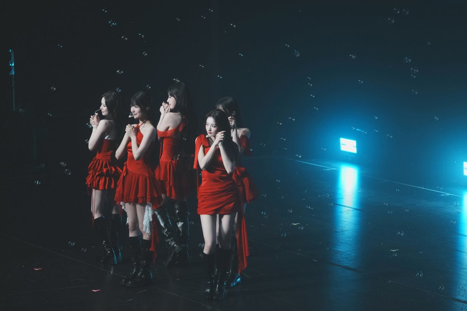 公演もいよいよ後半戦!雪が舞い降りる映像とともにスタートしたのは「White Memories」。赤いサテンのミニワンピースに黒ブーツという衣装に着替えてオンステージした5人は、シャボン玉が天井から舞い降りるファンタジックな演出の中、後半戦のスタートにふさわしい華やかなステージでふたたび会場のボルテージを上げると、ピンク色のライトに染められて「DM」へと続く。客席からの掛け声の熱もさらに上がり、それに呼応するように5人も熱を帯びながら切れ味よいパフォーマンスを繰り出すと、LEDに映し出される打ち上げ花火も相まって会場のボルテージは最高潮に。すかさずMCで「本当にアツいね!」(ナギョン)とメンバーたちも会場の盛り上がりに手応えを感じていることを伝えると、本公演がワールドツアー「NOW TOMORROW.」の最終日であることに触れ、「メンバー本当にお疲れさまでした。メンバーに拍手をお願いします! そして6カ月間いつも隣で応援してくれたスタッフのみなさんも本当に力になりました」(ナギョン)、「メンバーたち、毎日ポジティブな気持ちをありがとう。floverのみなさんもいつもありがとうございます」(ジウォン)などと最終日だからこその気持ちを届ける。ここでもトークの脱線を会場があたたかく見守る時間を織り交ぜながら、いよいよラストのセクションへ。