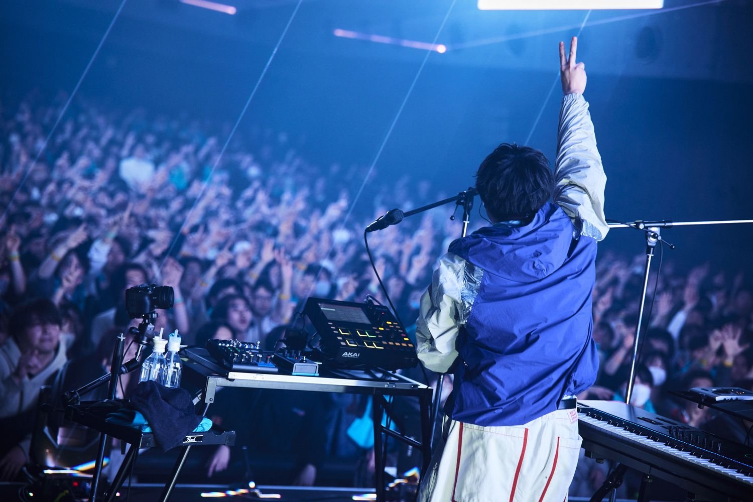 続いてハルハのラップと重なるように背景のリリックモーションが動き出す「ボクラノ(Remix)」では、讃美歌のように響き渡る美しいメロディがフックとなりオーディエンスの高揚感を煽ると、そこに影のあるハルハのラップが複雑に交錯し最高点へと向かっていく。ラストのDropパートではバンドメンバー、そしてヨナベも合流した次の瞬間、4つ打ちのバンドサウンドに変貌を遂げた楽曲は会場の空気を一瞬で飲み込んだ。