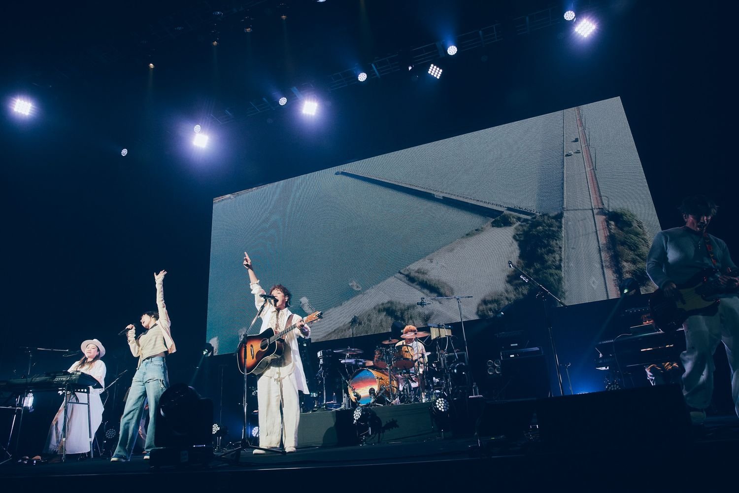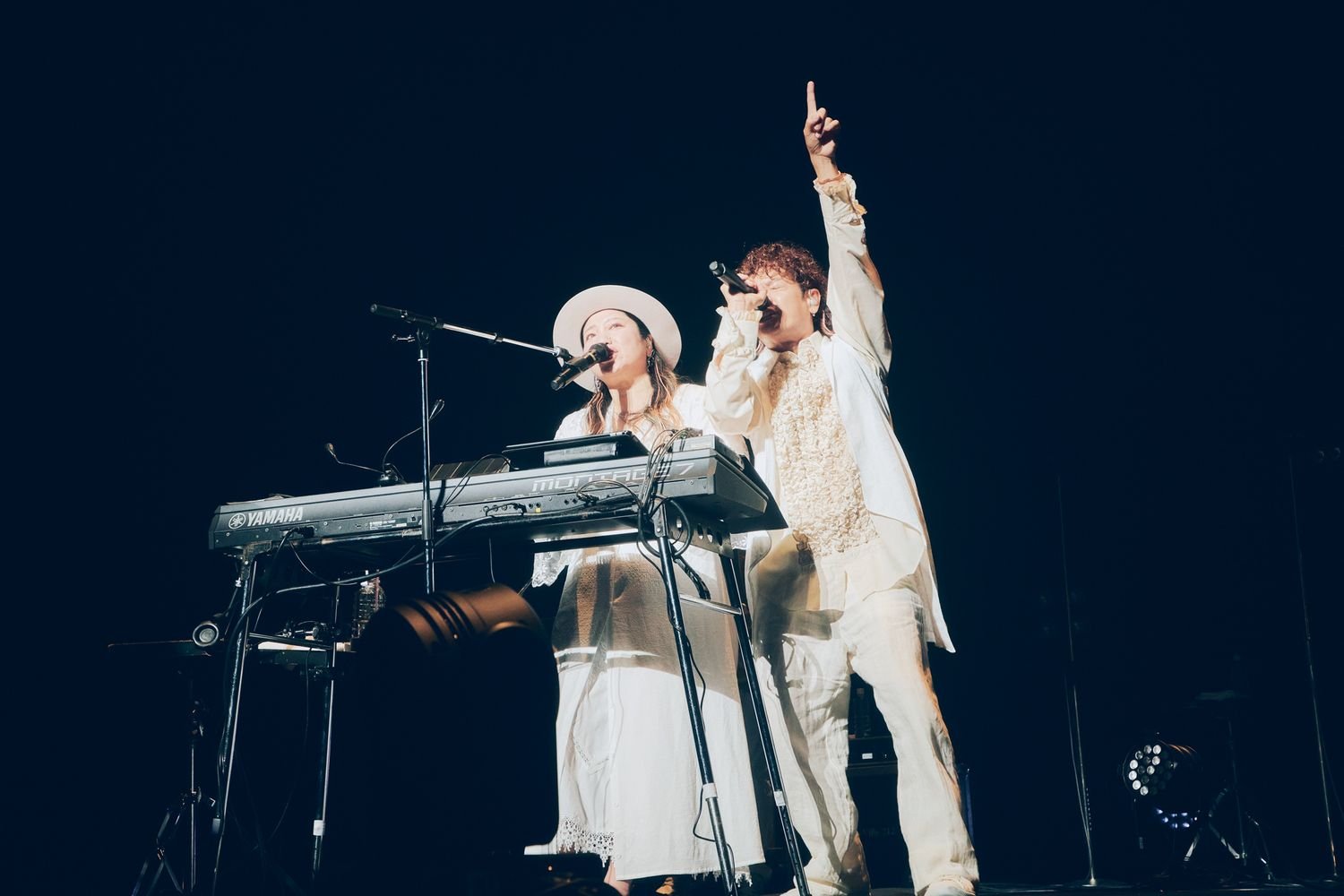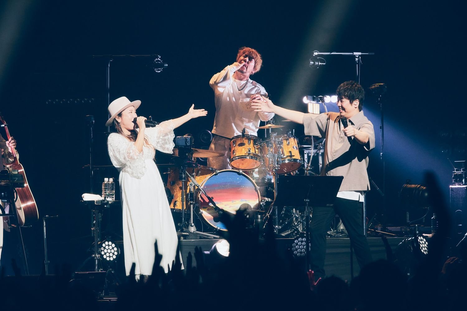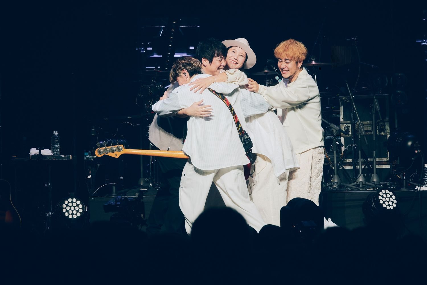 新里が「25周年を迎えられたのは皆さんのおかげです! HYの過去を届けて皆さんに未来を届けます!」と宣言。最初のゲストはスキマスイッチの大橋卓弥だ。仲宗根が「HYのライブにゲストを呼ぶことはないじゃないですか」と言うと、メンバー4人が大橋が現れるはずの袖に向かって横一列になって待ち構える。大橋は「出辛いよ!」と突っ込みながら登場。披露したのは「366日(Official Duet ver.)」だ。美しい鍵盤の旋律の中、仲宗根のしっとりした歌と大橋のマイルドな歌が重なった時の美しさは思わず息をのむほど。この上ないハーモニーに微笑み合うふたり。小指と拳を合わせた後、大橋は仲宗根をハグし、「この後も楽しんでください!」と言って颯爽とステージを後にした。