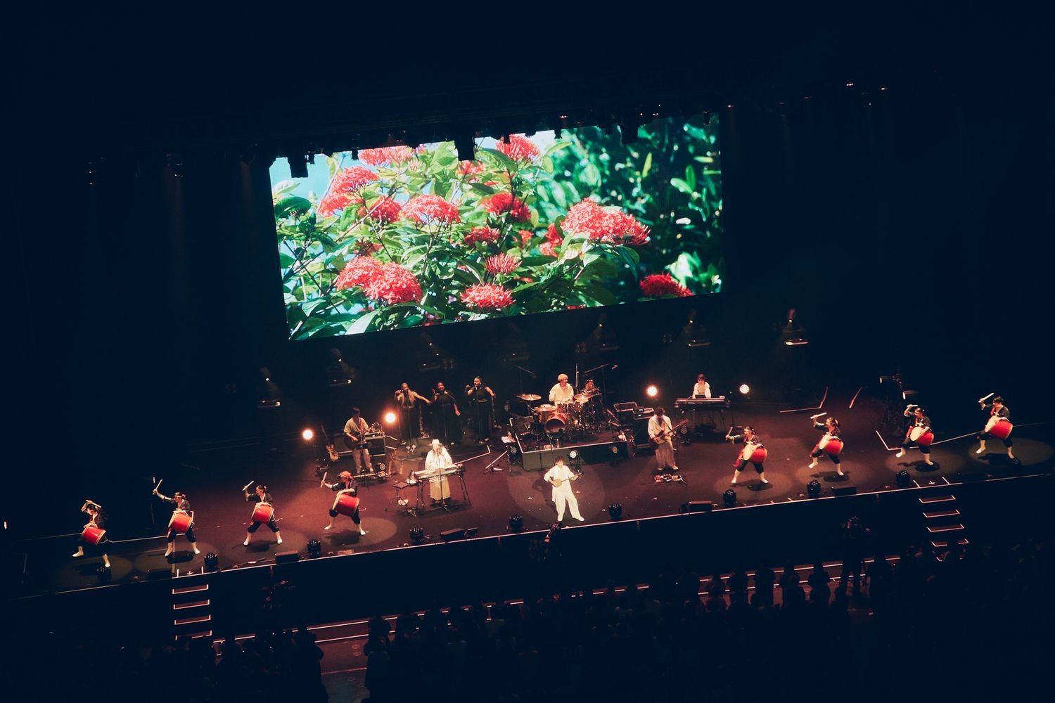 昨年の25周年ライブで行われたアコースティックセットもあった。ステージ前方にメンバーが横並びで座り、オーディエンスも着席。沖縄の満月の映像を背景にしての「いちばん近くに」。新里と仲宗根の珠玉のハーモニーが響き渡った。新里がサンゴ(白化サンゴ)の粉が使われた世界に一つしかないという三線を抱え「いつまでも沖縄の海、日本、世界の自然が残りますようにっていう想いがこもった三線です。この三線の音色に想いを込めて届けます」と言って、「そこにあるべきではないもの」を披露した。