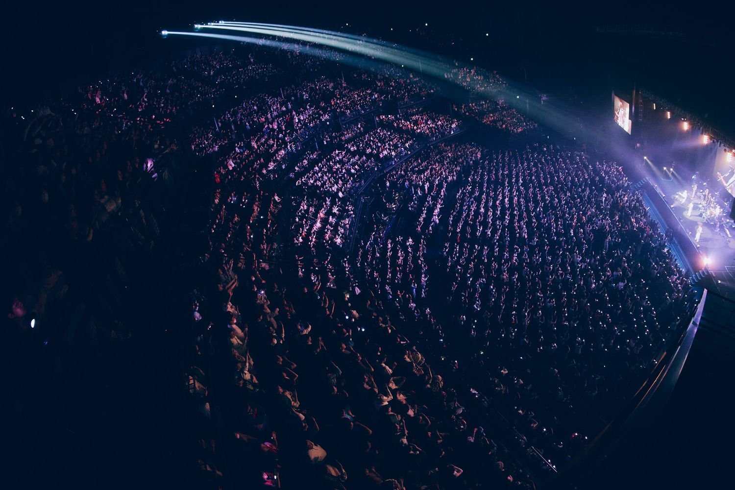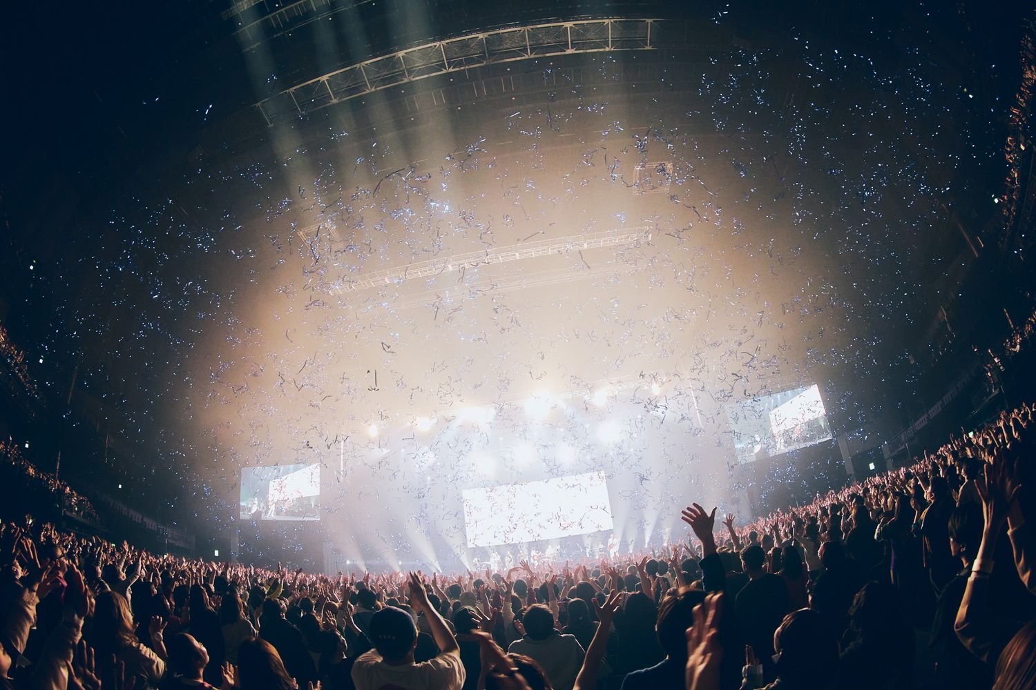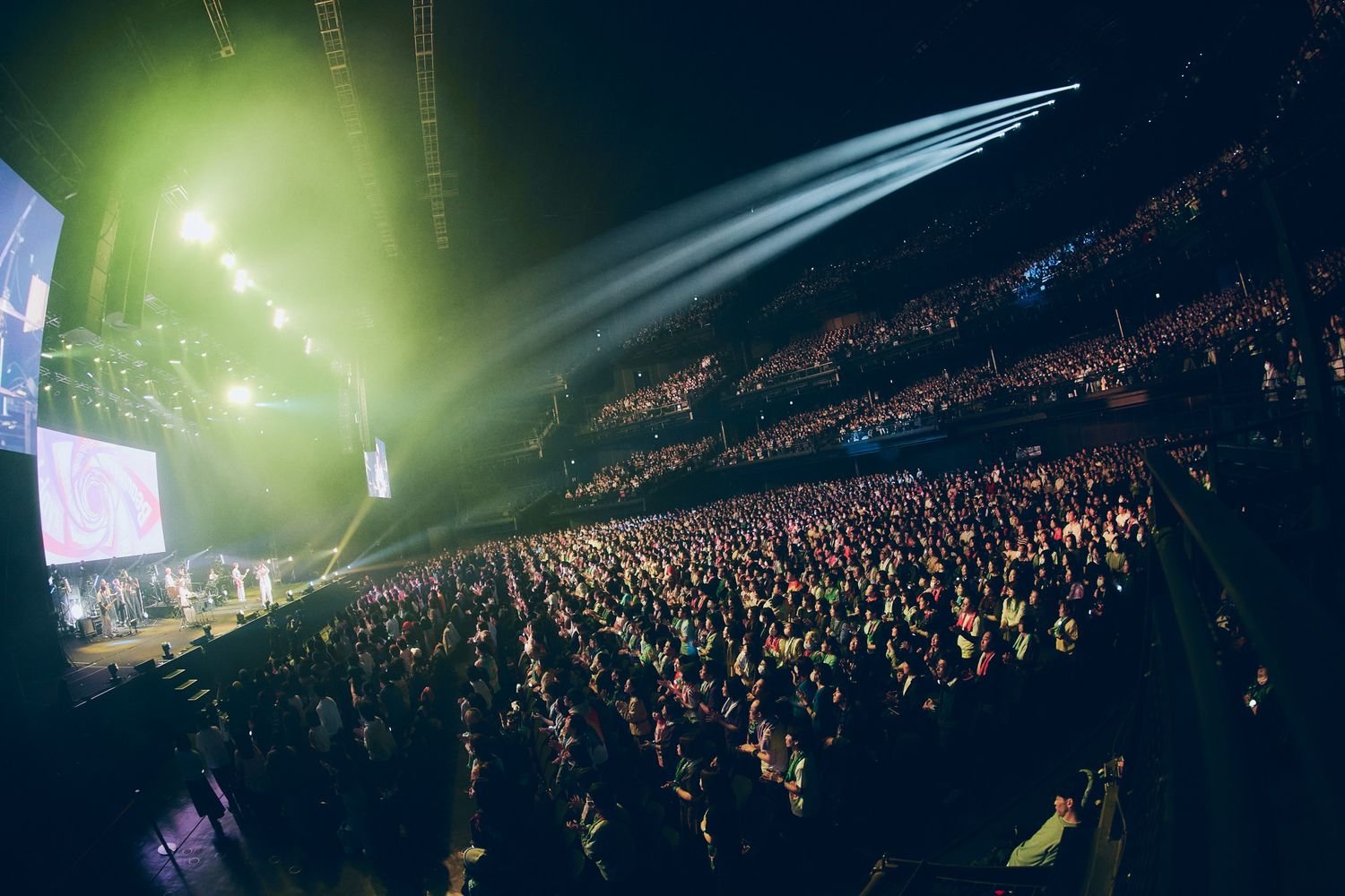 琉球國祭り太鼓が登場し、一緒に「Street Story」を披露。HYのライブではお馴染みのカチャーシー(沖縄の伝統的なダンス)と共に「イーヤサッサ!」という掛け声が響いた。約6000人がカチャーシーを踊る光景は圧巻そのもの。三線の響きと共に、琉球國祭り太鼓の華麗な演舞が展開され、仲宗根の祈りのような歌が響き渡った。