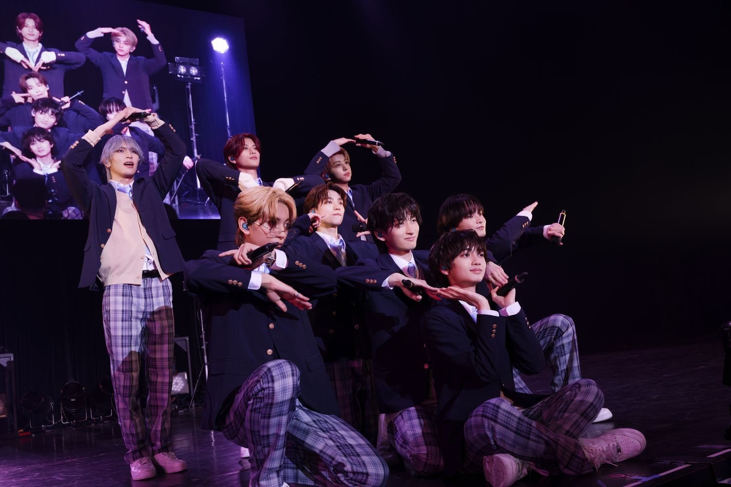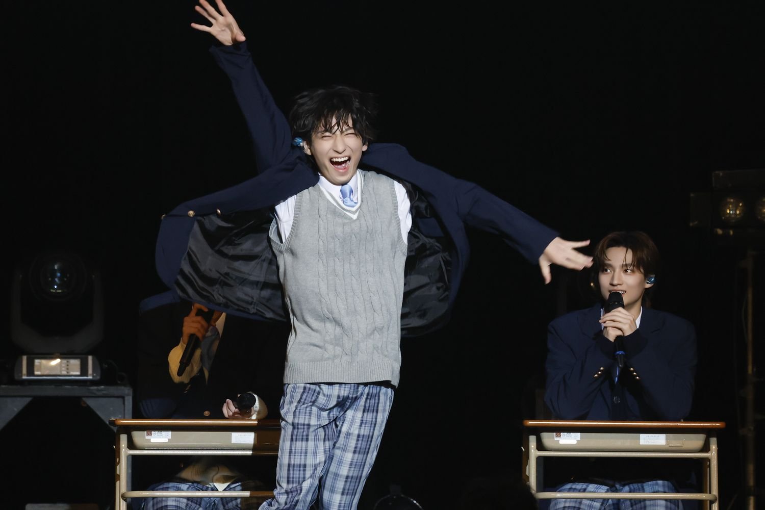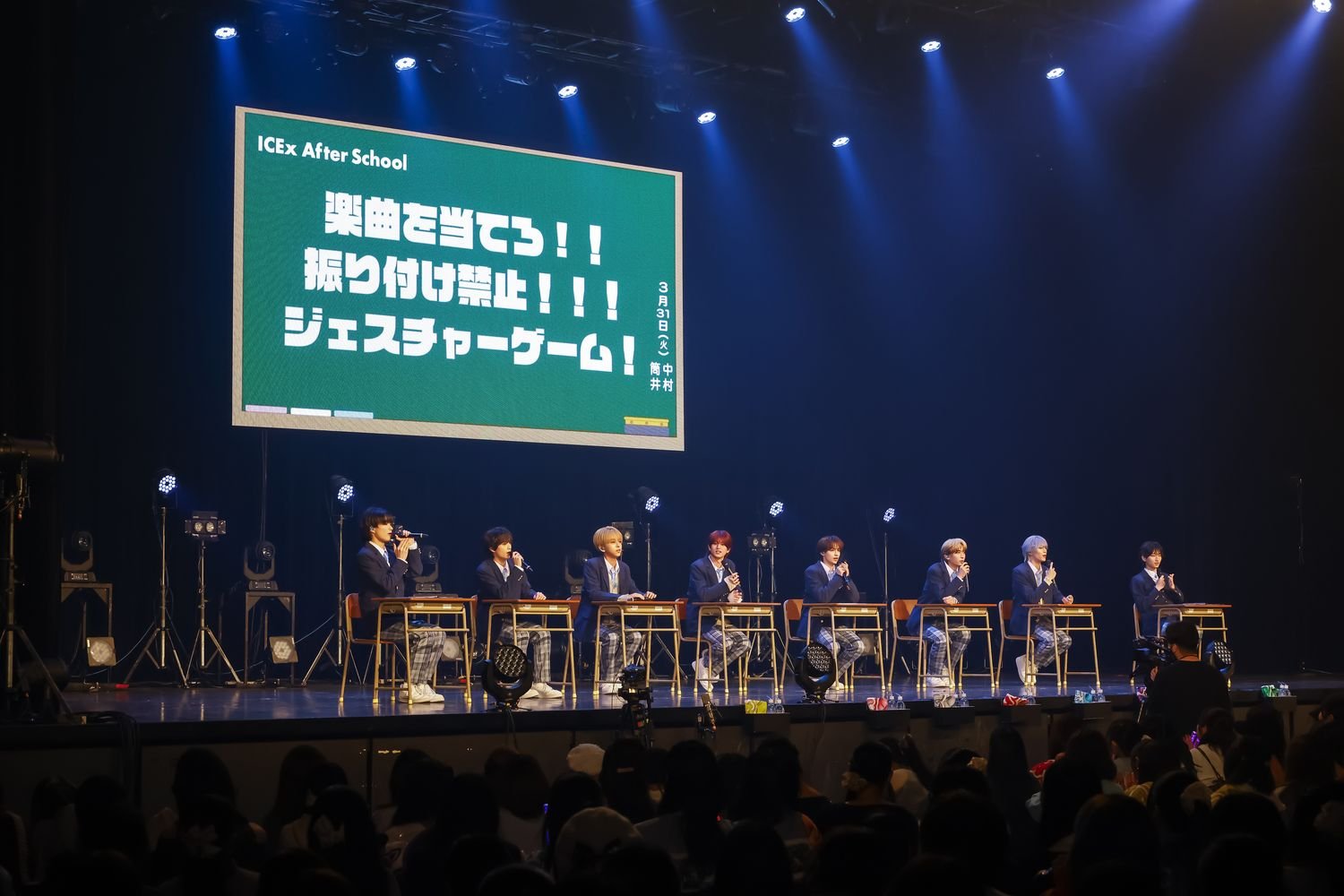 開演時間となり、場内が暗転すると、フロアには学校のチャイムが鳴り響いた。続いて、教室のように机と椅子が横一列に並べられたステージにブレーザーにチェックパンツという制服姿のメンバーが登場すると、満員の観客からの歓声が上がった。MCを務める中村の号令を合図にメンバーは着席。“ICEx After School”と題したイベントは、学校を舞台にストーリー仕立てのライブを展開した"ICEx School"をメンバーとともに振り返る<トークコーナー>からスタートした。