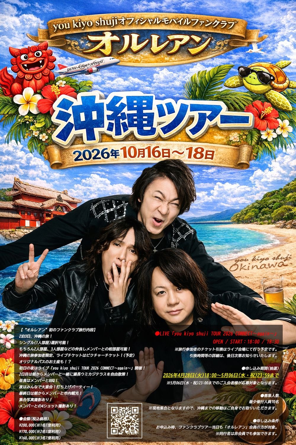 今回発表された「ファンクラブ旅行 in OKINAWA」は、10月16日から2泊3日での開催。期間中にはライブ『you kiyo shuji TOUR 2026 CONNECT~again~』の開催も予定されている。