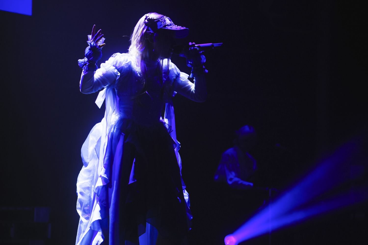 会場にはTシャツやタオルなど、思い思いのJELEEグッズを身につけたファンの姿。またこの日はリアルタイム配信も行われ、ネットを介して全国のぷかり隊が見守るなか、ついにライブの幕が開ける。一周することで1つの「旅」を表現したステージに、クラゲのようにふわふわしたブルーの衣装にサンバイザーを装着したJELEEが登場すると、1曲目に披露したのは「青一色」。かつて無観客の配信ライブを行った際に歌った曲だ。「JELEE 1stライブ、行くよー!」と元気いっぱいに挨拶すると、バンドの力強い演奏に呼応するようにエネルギッシュな歌声を放つ。客席のペンライトも青一色に染まり、さながら青く輝くクラゲたちの宴といった様子だ。