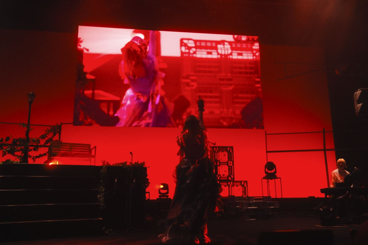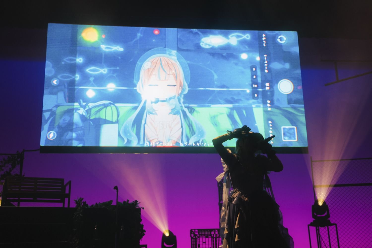 4人が海で遊ぶ幕間映像を挿み、深い海の底に光が射すような光景を描き出したのが「深海遊泳」。スクリーンにはファンアートに囲まれたJELEEのアバターの姿が投影され、ステージ上のJELEEと同期するように歌を口ずさむ。その幻想的かつエモーショナルな世界観に、会場はひと際大きな歓声と拍手で応えた。その深い海の世界から浮上するような、躍動感あるバンドサウンドと眩いライト演出が印象的だったのが、40mP「海を泳ぐ月」のカバー。“海月=クラゲ”を連想させるタイトルや不確かに揺れる気持ちを描いた詞世界も込みで、JELEEにぴったりな選曲だ。ステージ上手の信号機が赤に灯るなか、ベンチに腰掛けながら歌った「月の温度」の終盤では、JELEEが手を振るのに合わせて客席のペンライトも波のように揺れる。
