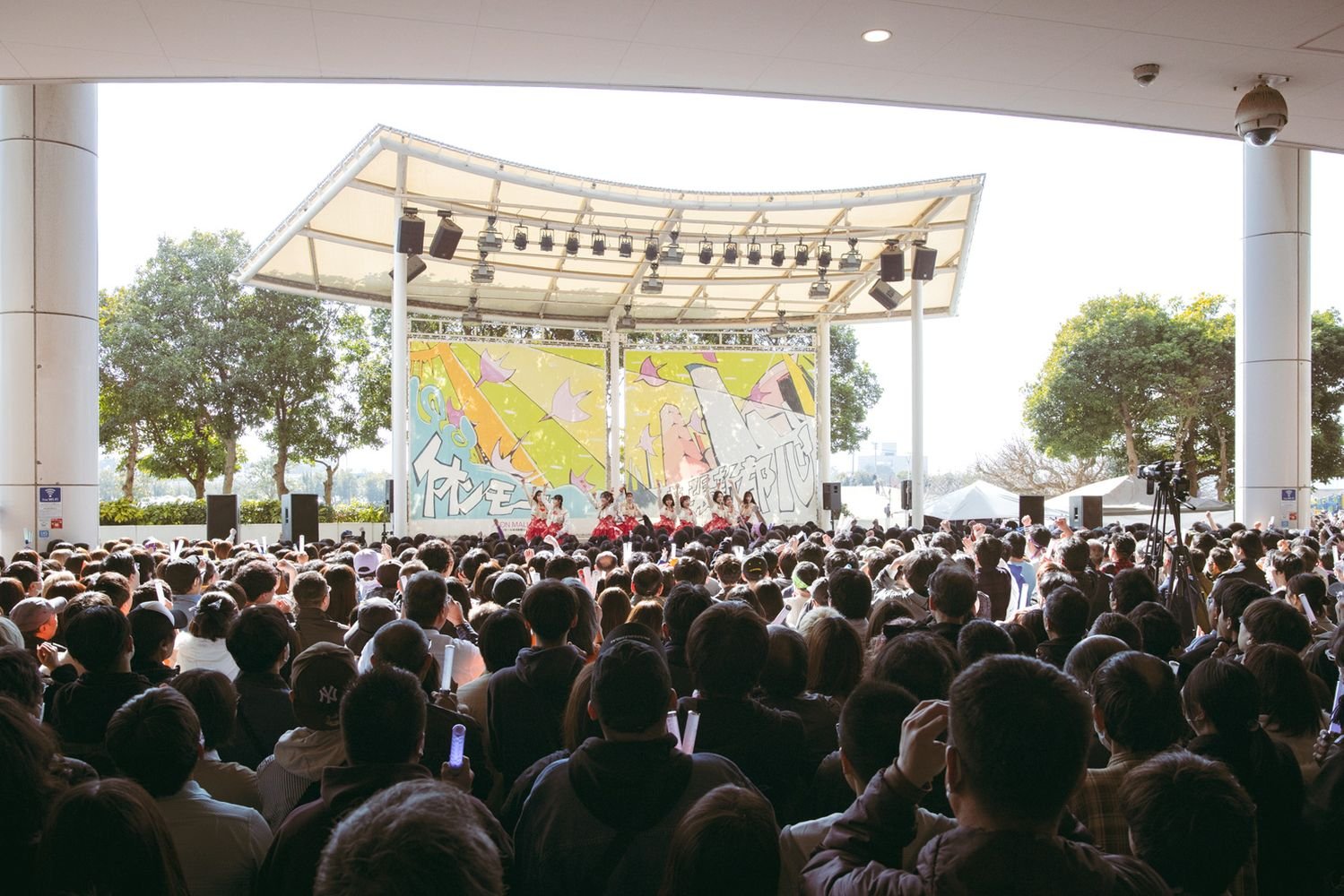 そんなグループの今の勢いを象徴するかのように、イベント会場には従来のファンに加え、“隙アモ”ブーム以降の新規ファンも集結。なかには自作のうちわを作って参加する子どもの姿も見られ、今回のイベントの優先エリア入場券とお見送り会参加券が付いた CD は、1 回目を迎える前に完売するなど大盛況。2 階の通路エリアにも立ち見が出るほどの賑わいをみせていた。また、三連休の中日ということもあり、ショッピングを楽しむカップルや家族連れもステージの近くで足を止めるなど、多くのファンが Juice=Juice のパフォーマンスに目を向ける姿が印象的だった。