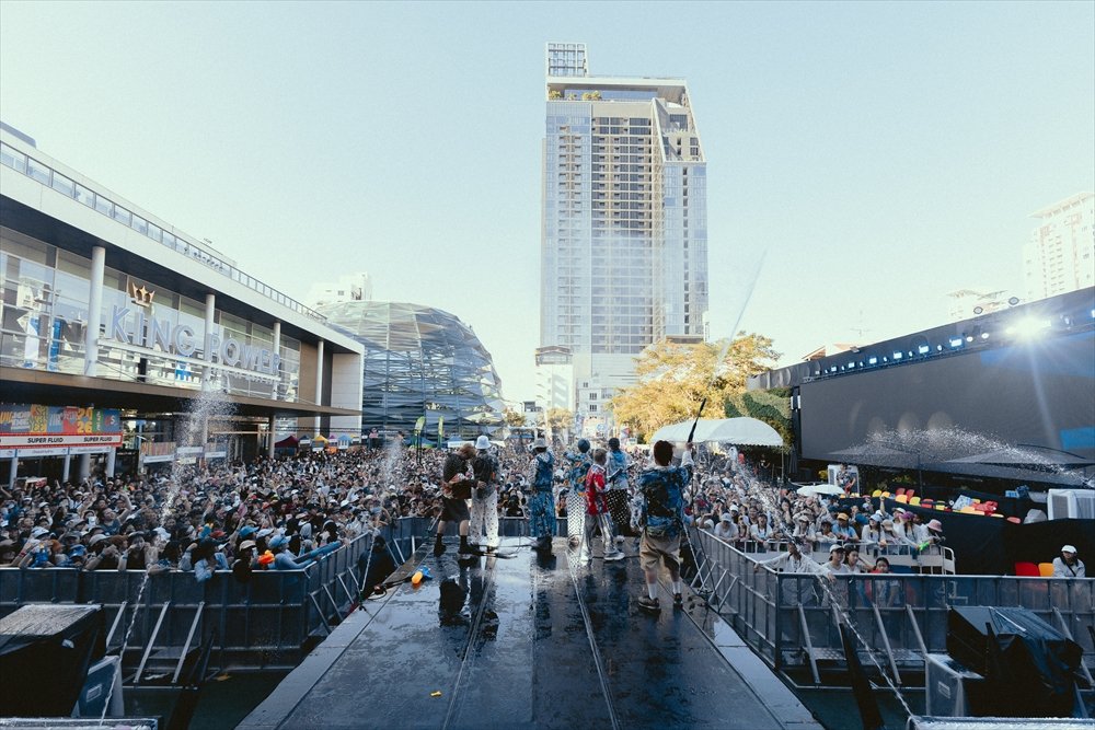 タイにおいて、1年の始まりを告げるソンクラーン。イベントでは、雰囲気を盛り上げるため、ステージ上はアーティストを含めびしょ濡れとなる。醍醐味である一方、ステージ上での対応力も求められる環境だが、3組はそれを感じさせない全力のパフォーマンスで観客を魅了した。