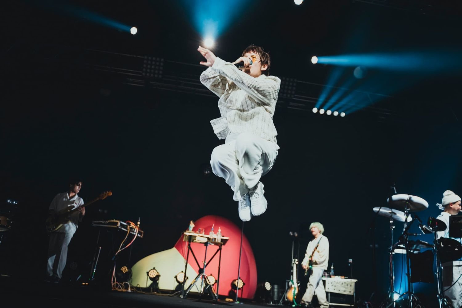 「ダンスは自由です。ダンスが下手でも初めてでも関係ない。今日この日を楽しみたいと思うならば、どうか、どうか自由に踊っていってください」と伝 え、そのまま「350ml Galaxy」に繋げる。曲中には熊木がジョッキグラスを持って登場すると、数千人のオーディエンスと一斉に”乾杯”を交わし、祝祭の空間を瞬く間に作り上げていった。勢いをそのままに、「HOUSE」や「実 感」、「一筋差す」などのフロアを熱狂させる楽曲や、「LIGHTHOUSE」、「太陽」、「コーヒー・セイブス・ミー」といった ポジティブなエネルギーを持ちながらも暖かさで包まれるような優しい楽曲を、彼らの最大の特徴である”インタールード”を駆使したノンストップのパフォーマンスで繰り広げていく。