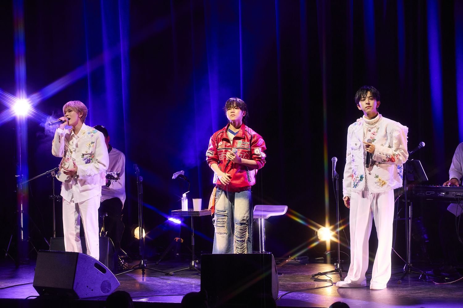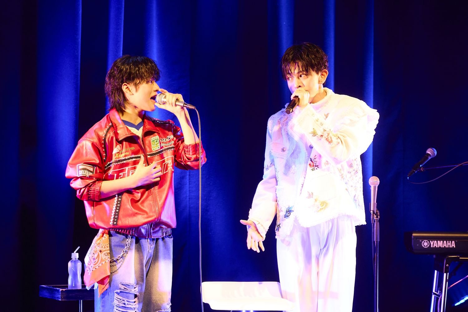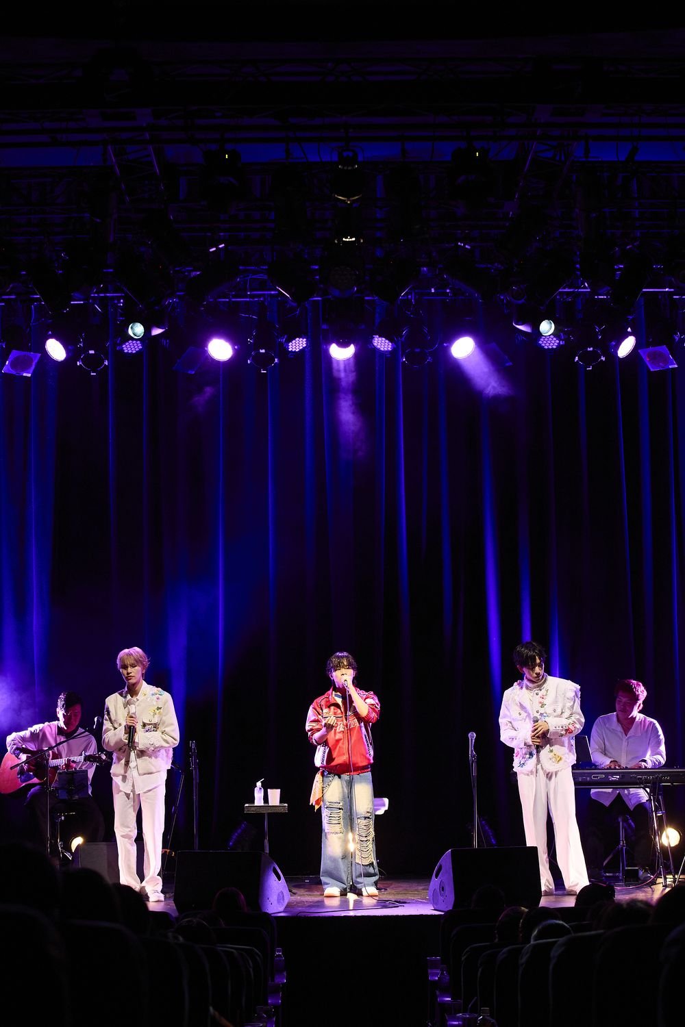 「すみません、あおりとかあんまり得意じゃなくて。普段のMCもメンバーに任せきりなんで、あんまりわかんないんですけど、自分なりに今日は構成をなんとなく考えてきたんで!」とうろたえ気味で、客席から“可愛い!”の声を呼ぶのも、ある意味でレアな顔と言えるだろう。そして「次の曲は、僕がどうしてもICExの八神くんと2人で歌いたいなと思っていた曲でして」と八神を呼びこみ、なんとKinKi Kidsの「愛のかたまり」を2人でデュエット。Bメロからサビでは武田と八神で主旋律とハモリを入れ替えながら、繊細なハーモニーを聞かせ、16歳と17歳のスペシャルコラボでオーディエンスの大喝采を呼んだ。歌い終えて退場しようとする八神を「ちょっと話そう」と引き止め、武田が「僕がやりたいって言ったら、やってくれて! しかも、ハモリも超キレイ!」と賞賛すれば、八神も「創世に“やろう”って言われたら、みんなやっちゃうよね。可愛いもんね」と返答。「1つの夢叶ったわ!」と興奮気味の武田は、最後に「僕の十八番的な歌で、絶対にやろうと思っていた曲です」とOriginal Loveの「接吻」を披露した。歌いながら堂々と身体を揺らす武田に客席からはクラップが贈られ、それに応えるように武田もステージを右へ左へと移動しながら、オーディエンスとの一体感を楽しんでいく。歌い終えると「いや、楽しいね!」と満面の笑みを見せ、「せっかくなんで」とICExの2人を呼び込み、3人で順に今日の感想を伝えていった。
