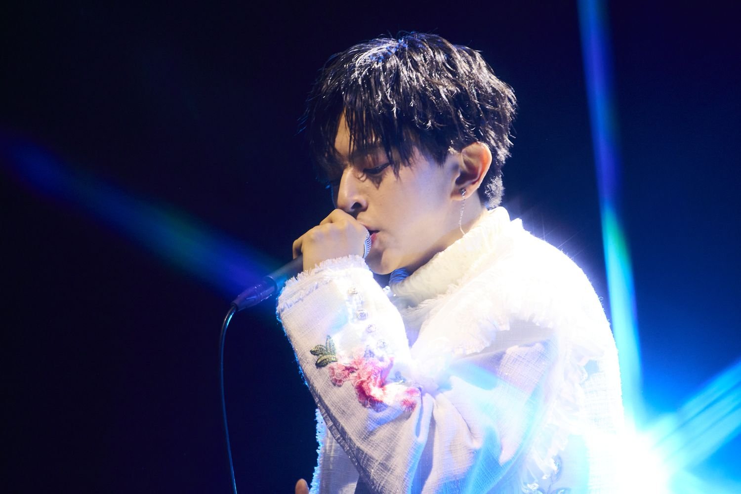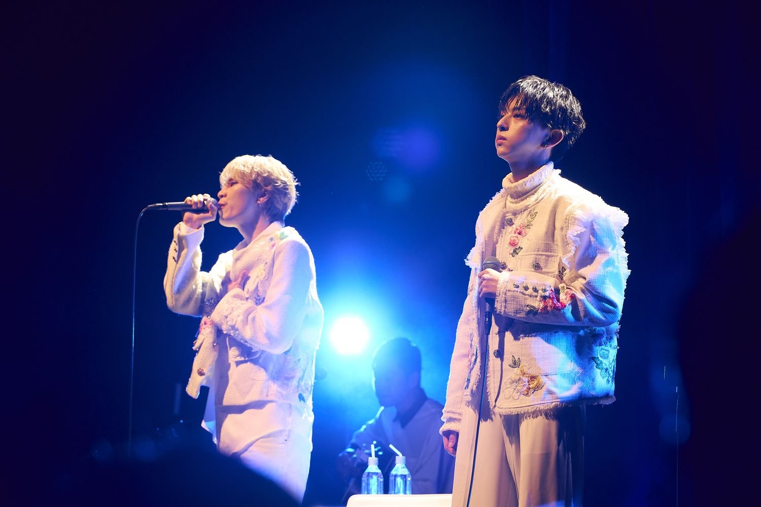 ここで千田からバトンを渡されたICExの最年少・八神は、おそろいの白い衣装でJ-POPを代表する往年のラブバラードを2曲披露。まずは藤井フミヤの「Another orion」を、17歳とは思えぬ大人びた情感あふれる歌声で聴かせ、曲に込められた深い愛の世界を描き出していく。だが、生バンドと一緒に歌うのが初めてなのは彼も同様。「すーごい緊張しておりまして……はい、すみません、ありがとうございます」と、熟した歌声とは正反対に初々しさを露わにするのが微笑ましい。そこから「じゃあ、いこうかな」とタイトルコールしたのは、徳永英明の「レイニーブルー」。今度は立ち上がり、深い響きをたたえた声を、クライマックスでは絞り出して終わった恋を嘆き、ステージに見えない雨を描き出していった。さらに「せっかくなので」と八神が千田を呼んで、2人で米津玄師の「灰色と青」を歌唱。1番を千田、2番を八神と歌い分け、クライマックスでは掛け合い、声を合わせ、同グループのメンバーならではの阿吽の呼吸によるドラマティックなパフォーマンスで、客席の拍手を呼んだ。