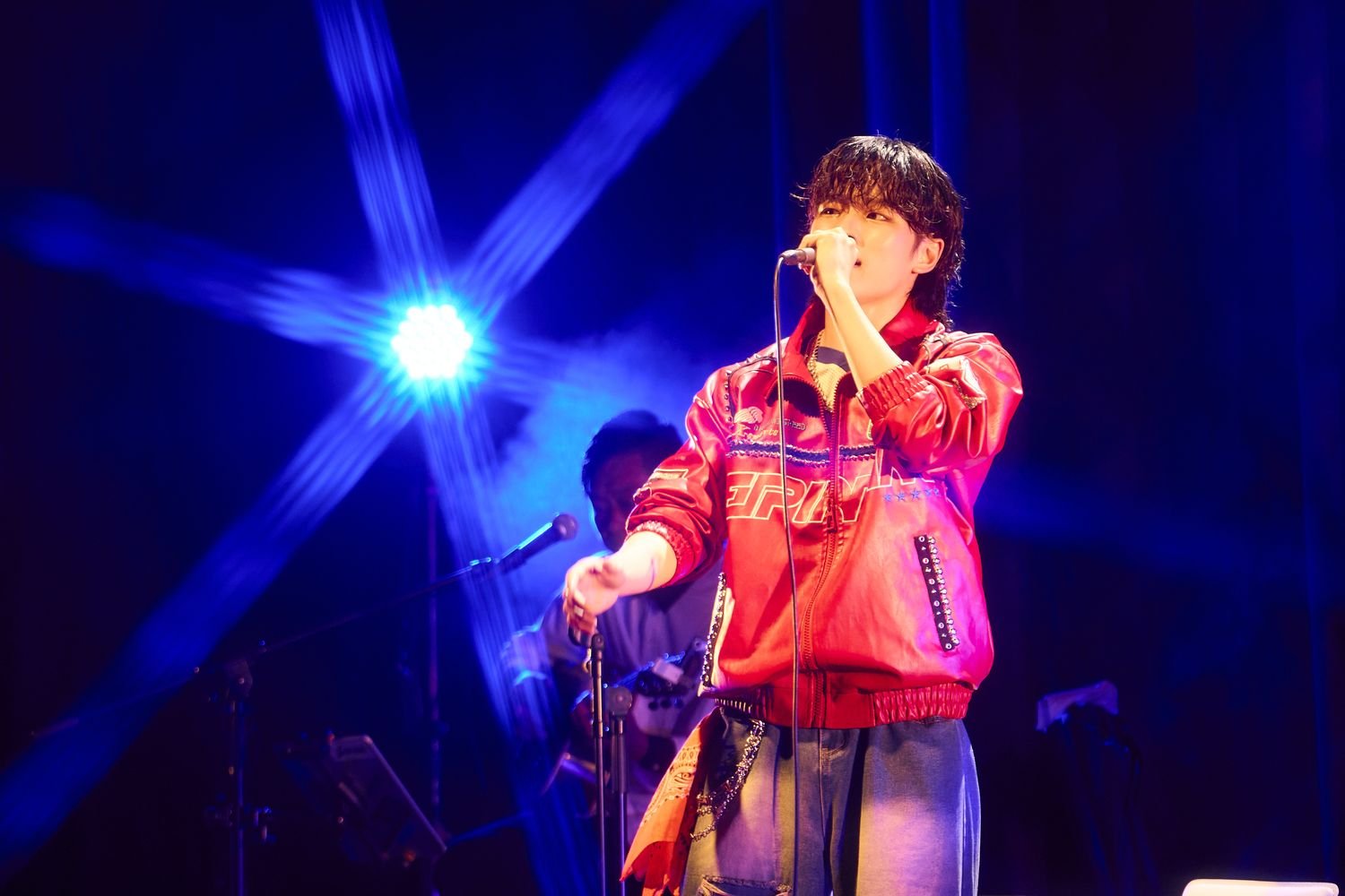 トップバッターのケタチガイは、アーティスト“mona+”によるソロプロジェクト。この日はVaundyの「napori」を皮切りに、アコースティックギターでの引き語りスタイルで5曲をカバーした。彼女の最大の特徴は空から降りかかり、大地を覆うようなスケール感のあるボーカル。その歌声の妙味を音数の少ないギタープレイで際立たせた「napori」に続き、優里の「ドライフラワー」で聞かせる肝の据わった太い歌声も、終わった恋への未練を引きずるのではなく、まるで吹き飛ばすかのような力強さがある。逆光照明で表情がうかがえないぶん、音だけがダイレクトに刺さってくるのも効果的だ。