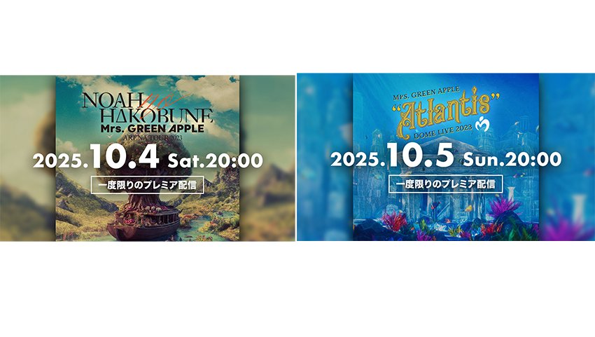 ミセスは、今年10月から12月にかけて12公演で55万人を動員予定の自身最大規模となる5大ドームツアー『Mrs. GREEN APPLE DOME TOUR 2025 "BABEL no TOH"』を開催予定で、現在、そのチケットの“ぴあ2次先行受付”(→ https://mrsgreenapple.com/news/detail/21870 )が明日10月2日(木)23時59分まで行われているが、その"BABEL no TOH"へと繋がる系譜=ストーリーラインのライブとして2023年夏に開催された「ARENA TOUR 2023 “NOAH no HAKOBUNE”」と「DOME LIVE 2023 “Atlantis”」の映像作品(2024年1月12日(金)リリース)の、一度限りのYouTubeプレミア公開が決定した。"BABEL no TOH"に参戦するファンのみならず、その連なる物語をぜひチェックしておこう。