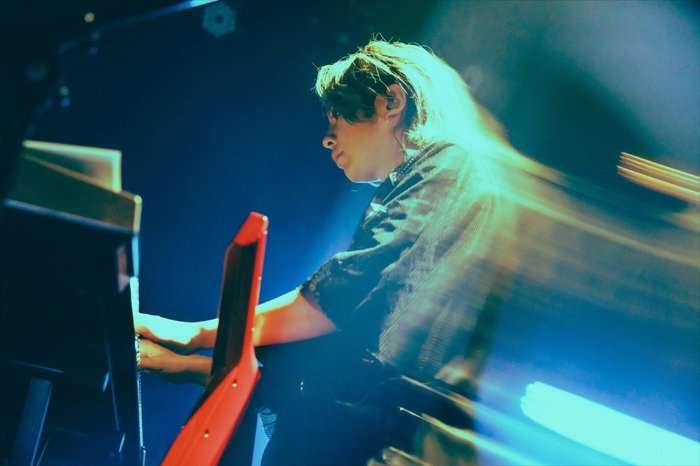 大学客員教授の肩書きを持つ反面でショルダーキーボードをアグレッシヴに弾き倒す姿もみせる鍵盤奏者・彩雨、