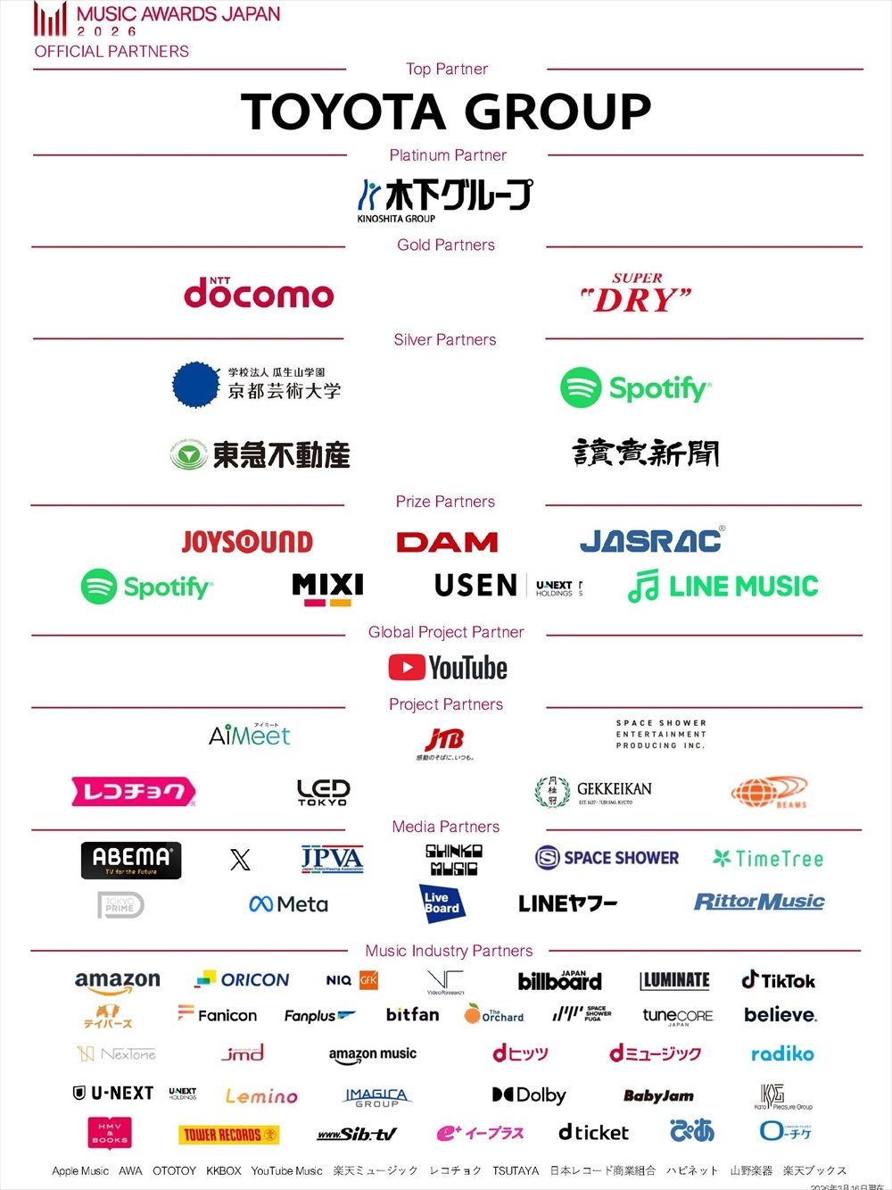 MAJ2026 ではプライズパートナーとなる音楽に携わる企業とともに、音楽リスナーの皆様に参加いただく部門を設けます。カラオケ、Spotify、有線放送などで一般リスナーの方に聴いて、歌って楽しんでいただいた楽曲の中から、最優秀作品を決定いたします。