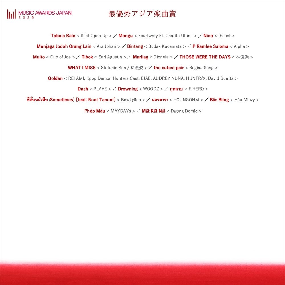 曲、最優秀アーティスト賞に 100 アーティスト、最優秀ニュー・アーティスト賞に 50 アーティスト、最優秀アルバム賞に 100 作品、Best Global Hit from Japan に 100 曲、最優秀アジア楽曲賞に 21 曲が選ばれました。そのほかにも、全部門※でエントリー作品が発表され、延べ約 2,000 のエントリー作品・アーティストが決定しました。全エントリー作品は「MUSIC AWARDS JAPAN」公式サイトにて発表しています。