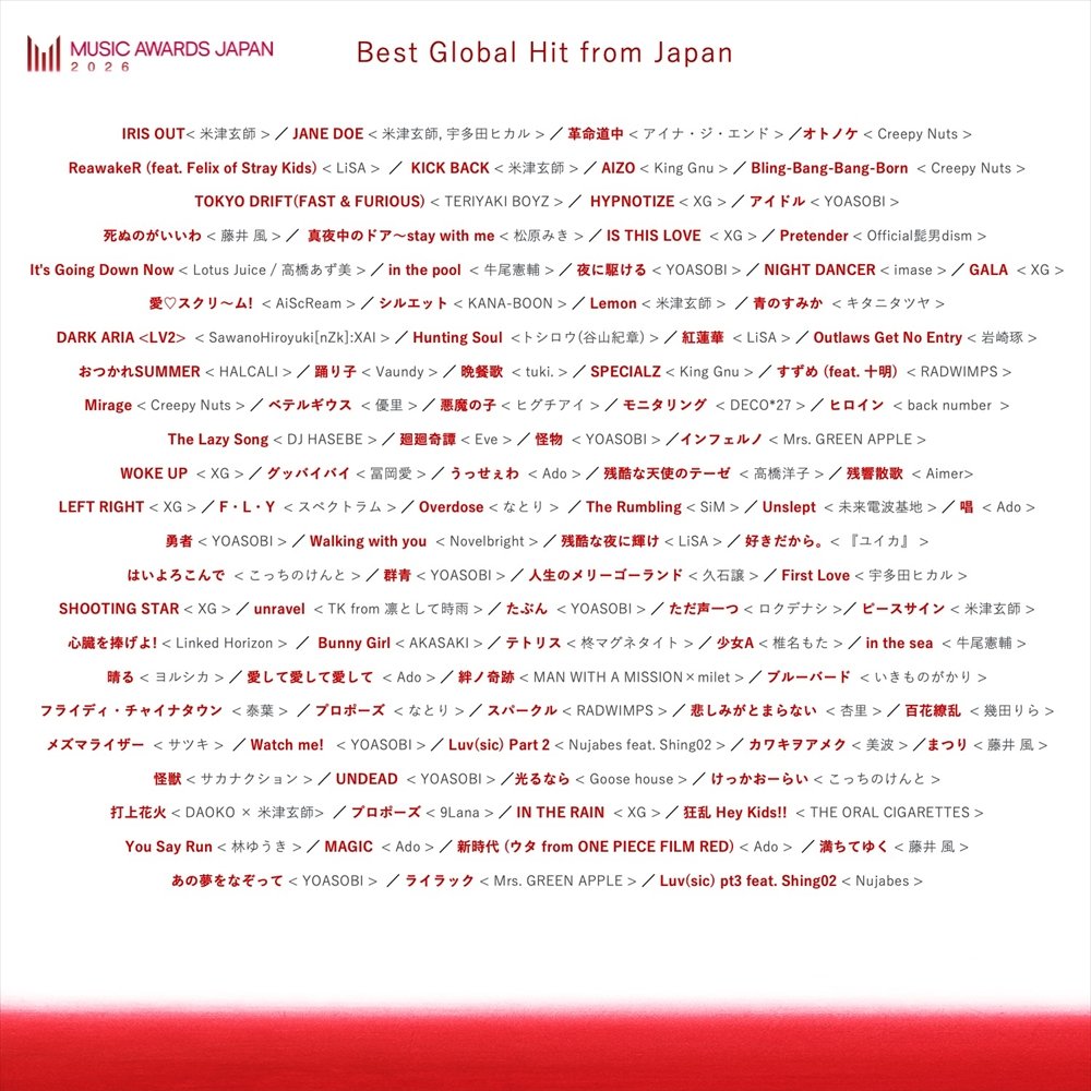 「MUSIC AWARDS JAPAN」は、「世界とつながり、音楽の未来を灯す。(ともす)」をコンセプトとした国内最大規模の国際音楽賞です。第2回となる「MUSIC AWARDS JAPAN 2026」は、6 月 13 日(土)に Grand Ceremony を TOYOTA ARENA TOKYO にて開催いたします。このたび、いよいよ授賞式で表彰する全 78 部門、そしてそのエントリー作品となる約 2,000 作品・アーティストが決定しました。主要部門を表彰する Grand Ceremony の模様は NHK にて生放送、その前に開催されるレッドカーペットの様子を NHK BS にて、さらに、 SGC ホール有明(東京ドリームパーク)で開催される主要部門以外を表彰する Premiere Ceremony の様子を TOKYO MX にて放送いたします。また、Premiere Ceremony および Grand Ceremony の様子は、グローバルプロジェクトパートナーである YouTube にて全世界配信(※一部地域を除く)、ゴールドパートナーである NTTドコモの映像配信サービス Lemino、ABEMA、radiko でも生配信いたします。さらに Spotify や TikTok、X、 YouTube などの SNS プラットフォームでも、ショートコンテンツの発信を行います。