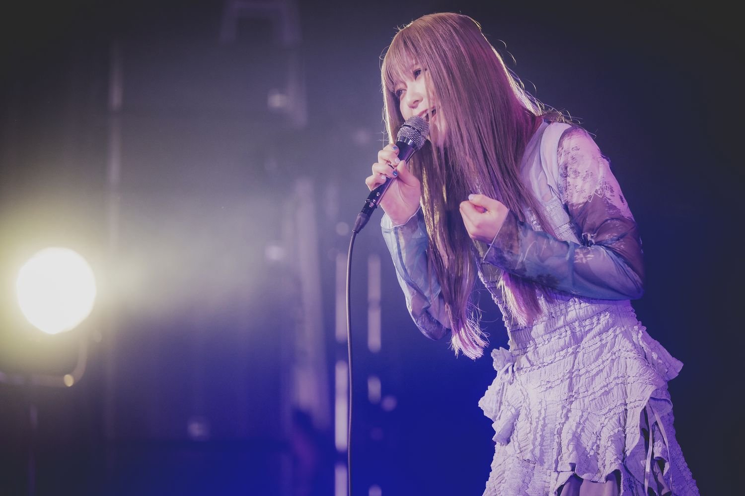 そして、約9カ月ぶりとなる本ツアーは3月21日(土)に名古屋・DIAMOND HALL、3月22日(日)に大阪・なんばHatch、そして、3月29日(日)の東京・Zepp Diver Cityの3箇所で開催。昨年12月にはMyukとしては初となる、熊川みゆ時代からは実に4年ぶりに本人が顔出しで出演したMV「雪唄 -yukiuta-」を公開したことも関係していたのだろう。これまではMyukの世界観に没入させるストーリー仕立ての構成がメインだったが、今回は音楽で紡ぐ物語性はそのままに、これまでの活動を振り返りつつ、観客と一緒にライブを楽しむという新たな要素も加えたステージとなっていた。