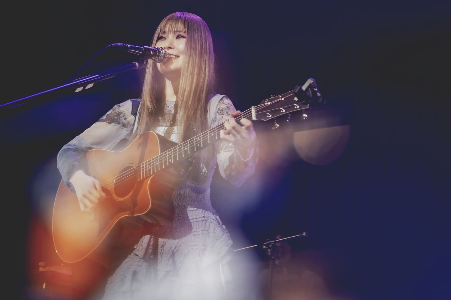 MCがわりのナレーションが教えてくれるのは視点の変化だ。最初のナレーションでは星を眺めていた主人公の体がふわりと宙に浮き、やがて空に同化していく様が描かれた。アコギを置き、ハンドマイクでワルツを踊るように歌ったアルバムのタイトル曲「celeste」、メジャーデビューシングル「魔法」では星が煌めく夜空の全体像を見せた。2つ目のナレーションでは空から地上を見ると、見覚えのある人影を見つけ、それが自分自身であることに気づく。ステージ前方に踏み出し、拳を力強く握りながら、<大丈夫、ちゃんと生きていける>と歌いかけた人生讃歌「じゅもんを唱える」。観客一人一人を見つめながら、真っ直ぐに手を伸ばして、<もう大丈夫だから>と繰り返す「シオン」。そして、<ただ君のそばにいたい>と願い、遠く離れた場所にいても、<これからもずっと色付けていく>と約束し、<もうひとりじゃないよ>というフレーズを観客と共有した「ひとりじゃないよ」。明日を生きる意味や勇気を与えてくれるメッセージソングを続けた彼女の歌声は観客の心にまっすぐに飛び込み、ステージと観客の距離をグッと縮める時間となっていた。