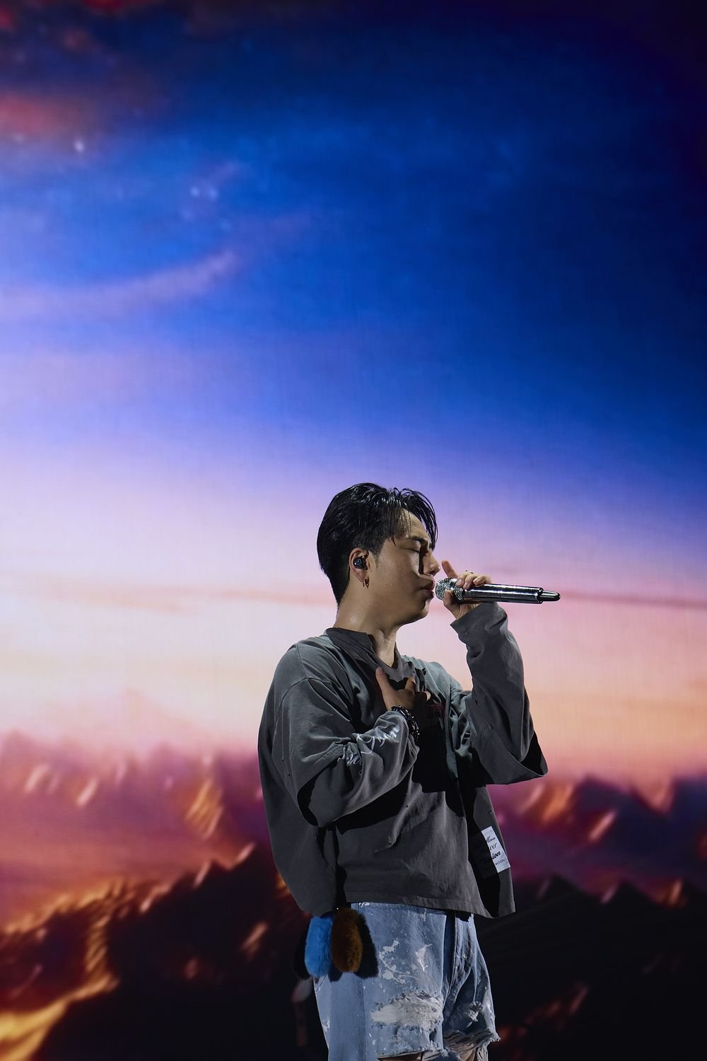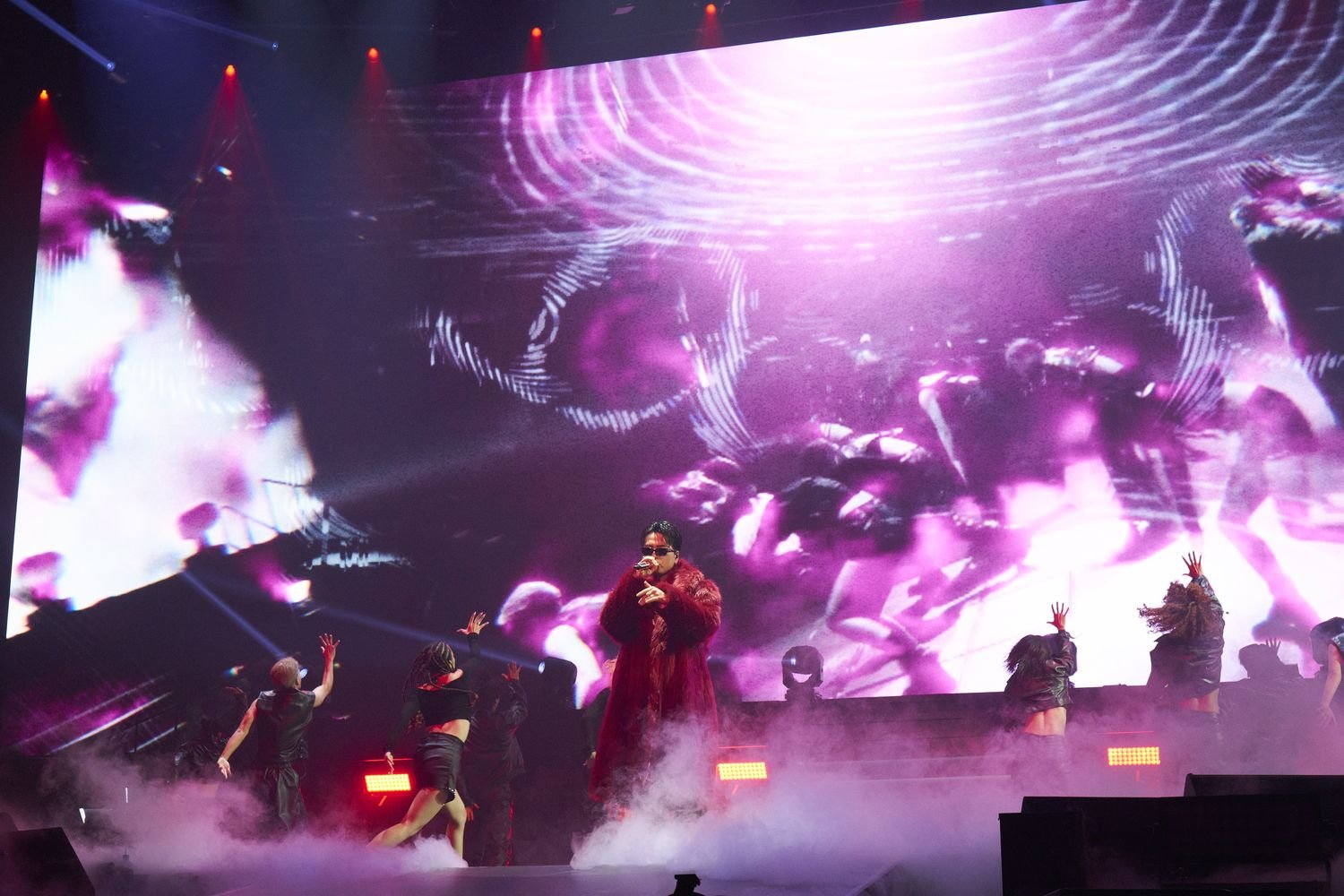 2曲目はSKY-HIとのFUSION曲「Purple Pill feat. SKY-HI」。プロジェクト最初のリリース曲として“レペゼン日本”をテーマに掲げ、ラップとボーカル一体のフローがループミュージックの中で流動する。3曲目「XXX feat. AK-69 & HIROOMI TOSAKA / SWAY」披露前、バックモニターにゲスト名「SWAY」が表示され、客席の期待高まる。まずステージ前方でØMIが歌い上げ、最初のゲスト・SWAYが登場した。客席からは思わず大歓声が上がった。SWAYが曲タイトルの「X」マークを示しながら、フレーズごとに力強く左胸を叩く。パフォーマンスを終えたSWAYが「ありがとうございました」と退場すると、熱気が持続する会場モニターには続いて「CB」の字幕が表示され、再び歓声が上がる…。