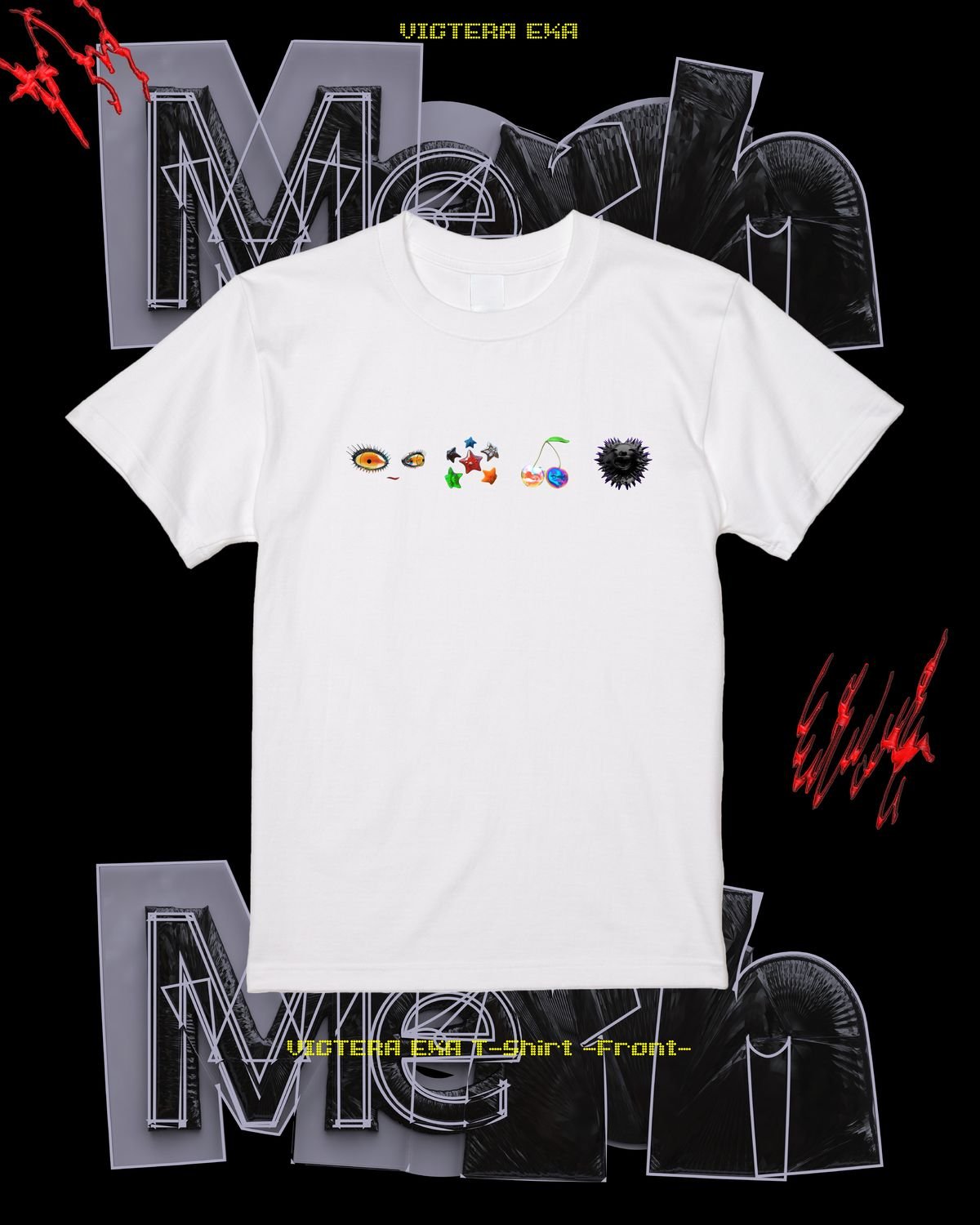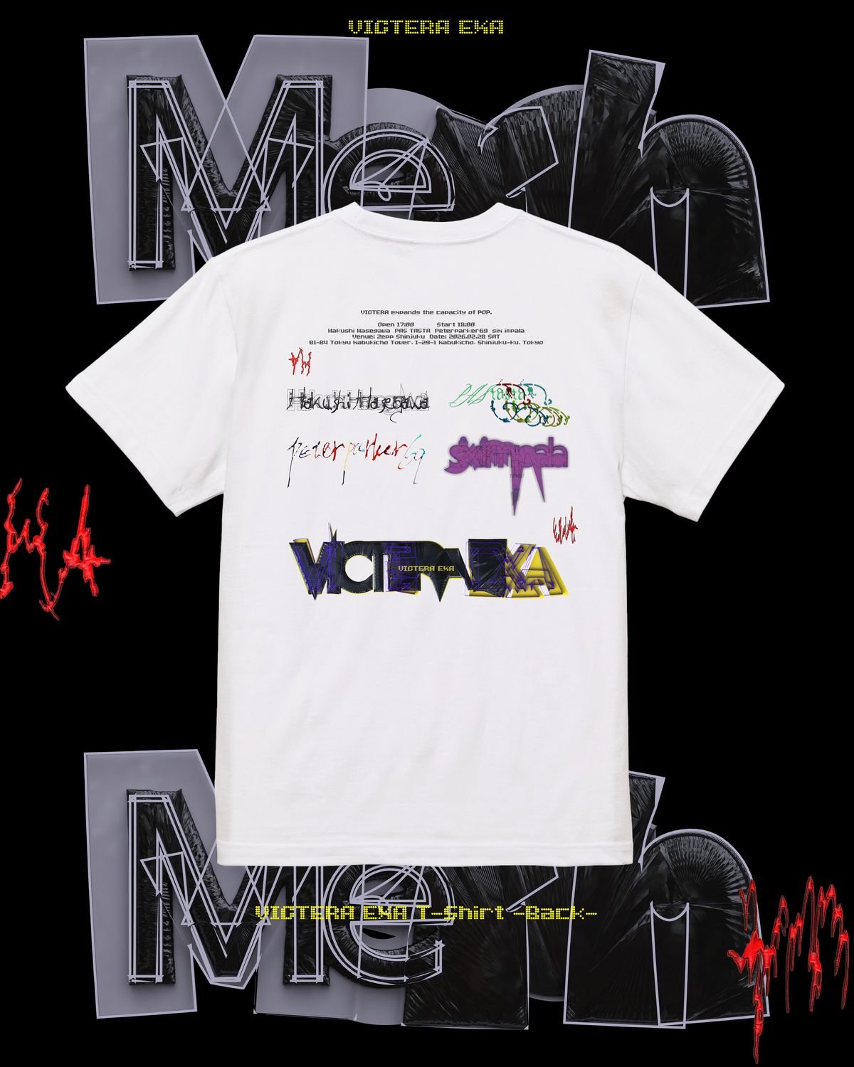 今回イベントグッズとして、Tシャツ2種とステッカー5枚セットのデザインが発表された。Tシャツ付前売りチケットに付属する「VICTERA EXA T-Shirt」はHeijiro YagiとTaketo Kikuchiのタッグが制作したキービジュアルを落とし込んだデザイン。今回のイベントを象徴する雰囲気に仕上がっている。