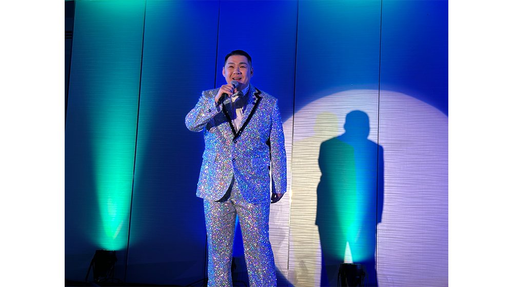 ディナーショーの幕開けは、上下シルバーのスパンコールで登場。
