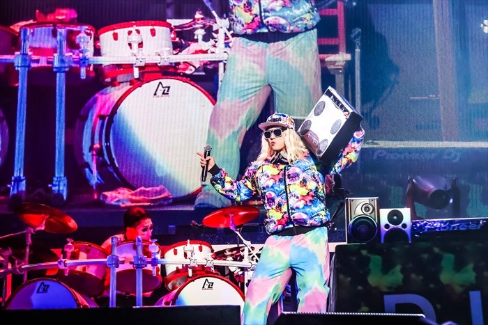 そのあとのギターソロでは、喜矢武がまさかの“下半身アフロ”姿で登場。途中、鬼龍院も“下半身アフロ”姿になり、樽美酒がアフロ部分にシャンプーまでし始めるというカオスな展開に。樽美酒は、最近パチンコ店でアルバイトを始めたという話から、ノリノリでパチンコマイクパフォーマンスを披露して、会場を沸かせた。