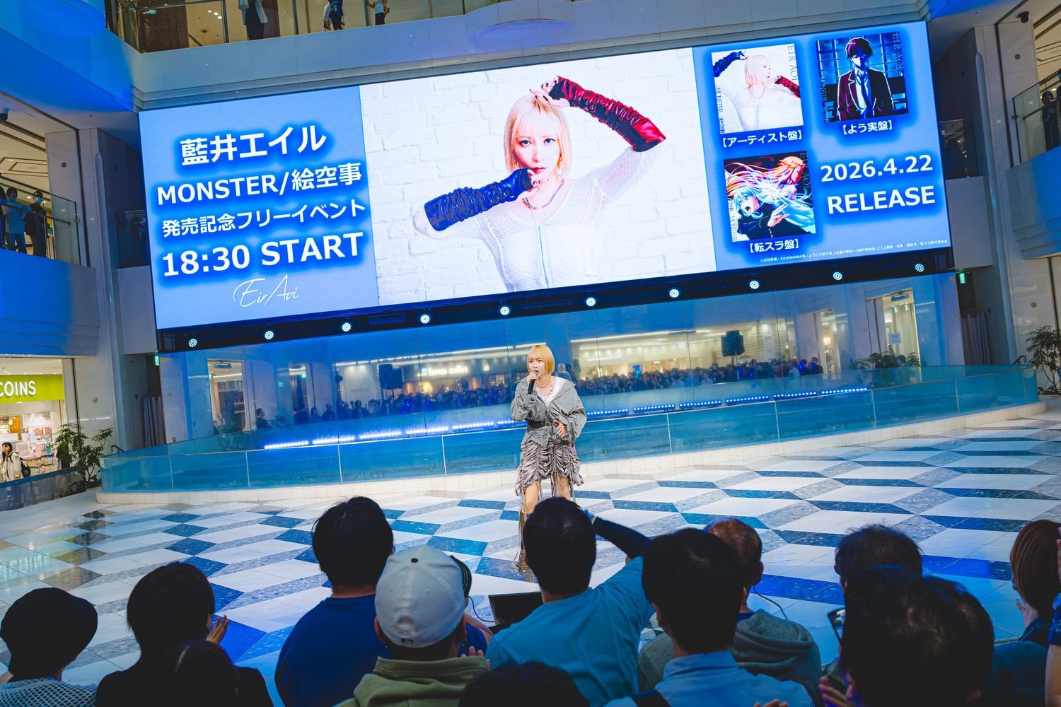 2026 年 4 月 21 日、東京・サンシャインシティ 噴水広場にて、藍井エイルのニューシングル「MONSTER/絵空事」発売記念フリーライブが開催された。2011 年のデビュー以来数々のアニメ主題歌を歌い、世界中を熱狂させてきた藍井エイル。4 月 22 日にリリースされるニューシングル「絵空事/MONSTER」は、彼女にとっておよそ 3 年半ぶりとなるアニメ主題歌となり、TV アニメ『ようこそ実力至上主義の教室へ 4th Season 2 年生編1 学期』オープニングテーマ「MONSTER」と、TV アニメ『転生したらスライムだった件 第 4 期』オープニング主題歌「絵空事」を収録したダブルタイアップとなった。ここではそんなニューシングルのリリース直前に行われた、サンシャインシティでのフリーライブの模様をお届けしよう。
