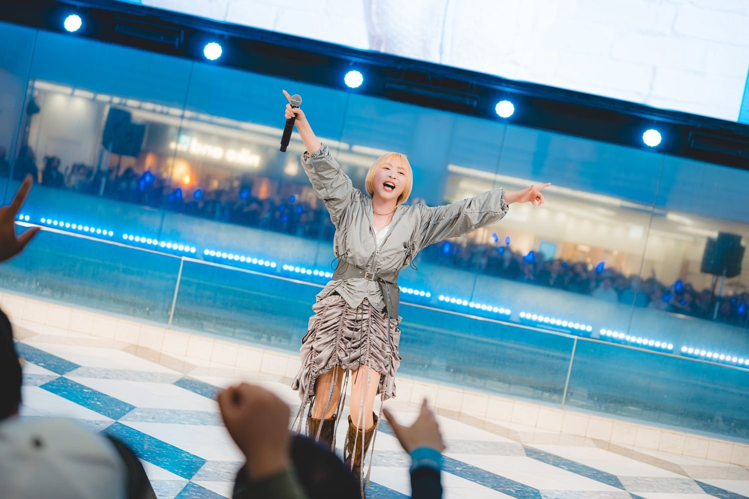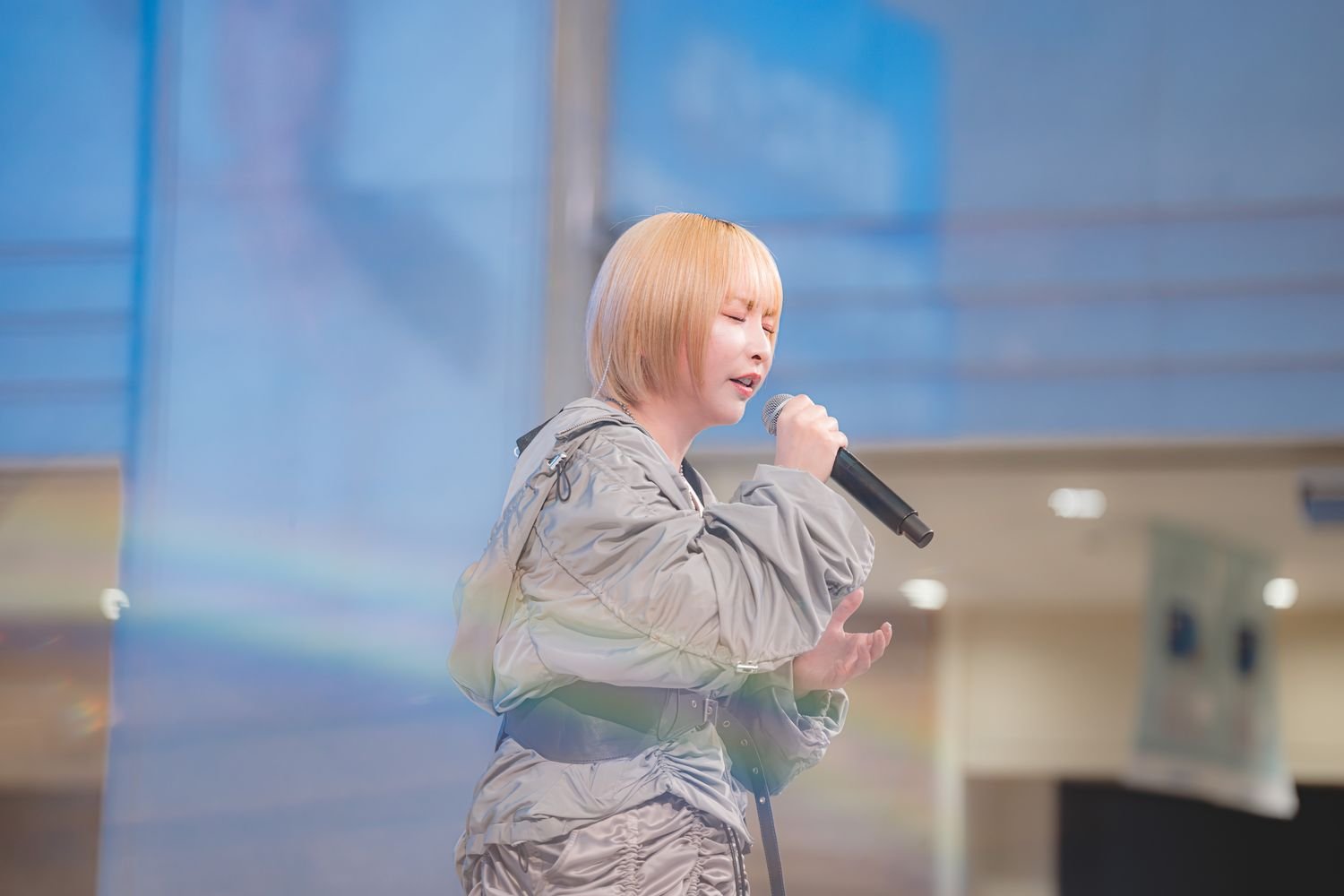 そして開演を迎えると、スタッフの呼び込みでいよいよ藍井エイルが大歓声と拍手のなか登場。登場するなり「こんばんはー! 約 10 年ぶりのリリースイベントになります。よろしくお願いします」と挨拶すると、ニューシングルのリードトラックのひとつ「絵空事」について、サビの直後でのシンガロングパートがあることを告げて、披露の前に何度か観客と一緒に歌う。そうしたレクチャーを経て、その「絵空事」でこの日のステージがいよいよ幕を開けた。軽快なロックサウンドが鳴らされると、観客の多くは彼女のイメージカラーである青いペンライトを灯しつつ軽快なビートに合わせてクラップするという、藍井エイルのライブで見られる光景が噴水広場にも展開された。そのなかでエイルは持ち前のハイトーンも駆使しながら軽やかな歌声を聴かせる。そしてサビが終わったあとには観客にマイクを向けながら、件のシンガロングへと誘導していく。まだリリース前の楽曲ながら早くも一体感が見られたパフォーマンスとなった。