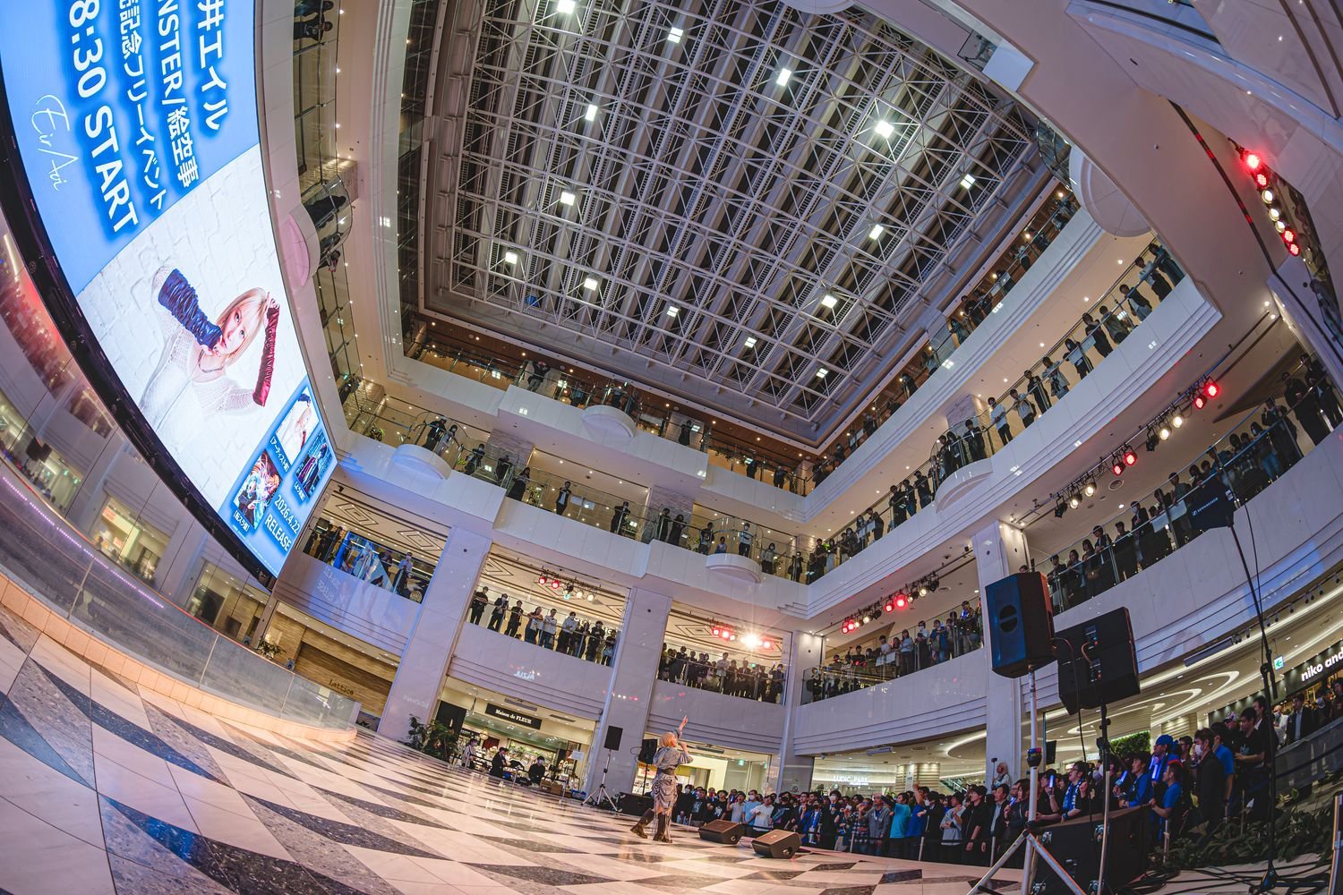 サンシャインシティの噴水広場にあるフリースペースには、地下 1 階から 3 階までの 4 階層を抜いた吹き抜けの構造になっていて、どのフロアからもステージを臨めるようになっている。開演前より前から集合した多くのファンは、地下 1 階のステージ正面だけではなく各フロアからこの日の主役の登場を待ち望んでいた。