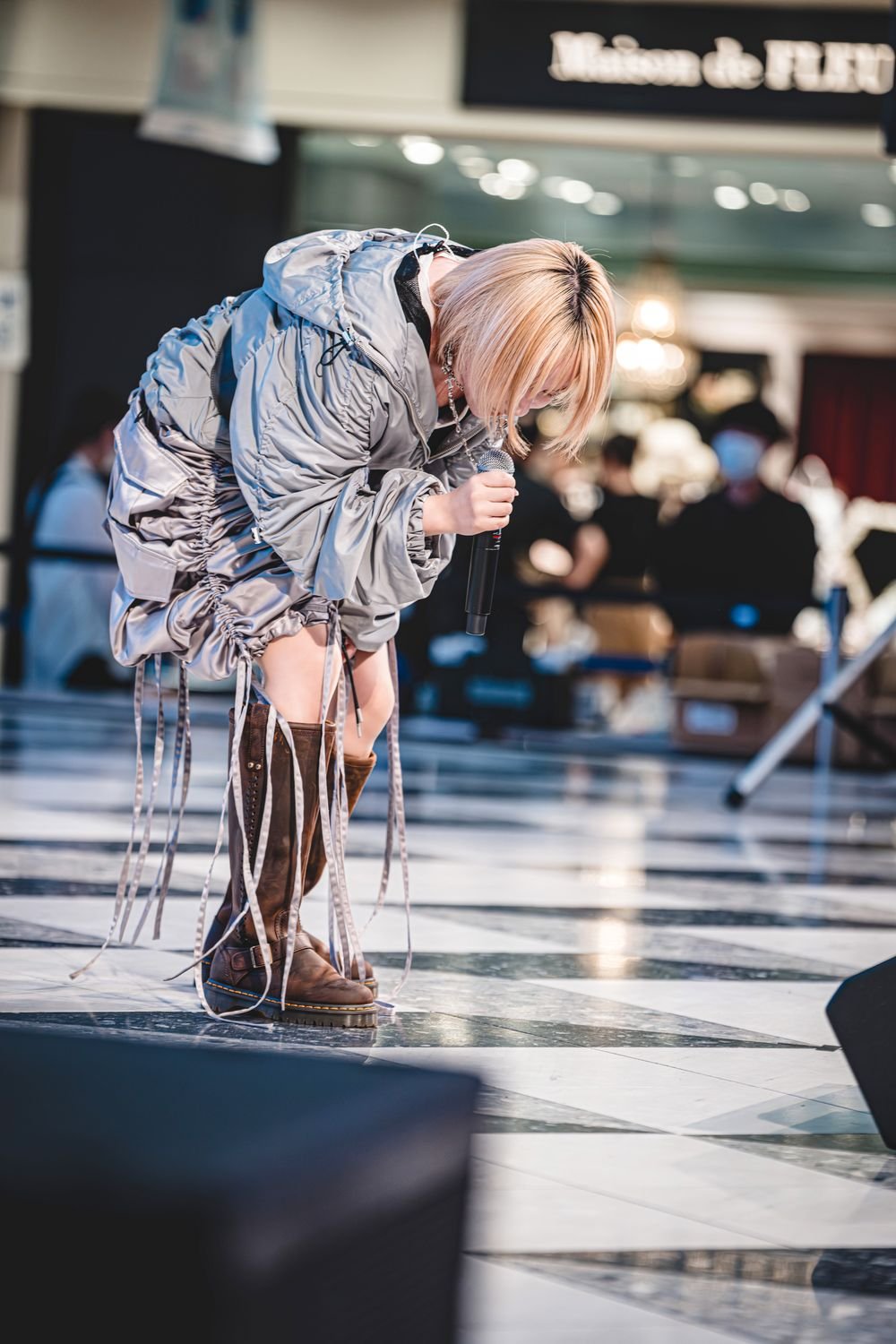 ロウからハイへ、またファルセットも駆使した自在かつ怪しげな歌唱は流石のひとことだ。そして続いてはもうひとつのカップリング曲「Decay」を披露。こちらもエイルの歌唱を存分に堪能できるミディアムナンバーであり、観客もただただ彼女のパフォーマンスに没入するように真剣な眼差しを送っている。また 4 フロア吹き抜けという天井も非常に高い会場だけに、音も反響せずに抜けていく構造になっているが、それが逆にここでのパフォーマンスをより幻想的なものへと変えているのも印象的だった。すでに TV アニメのなかで聴かれている「絵空事」や「MONSTER」に対して、カップリングはこの日集まったほぼ全員が初めて聴く曲だったが、そのなかでも抜群の存在感を見せつけた格好だ。