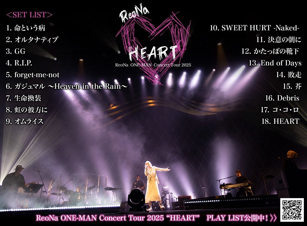ファイナル公演終演後には、完走した「ReoNa ONE-MAN Concert Tour 2025 “HEART”」のセットリストとプレイリストが公開された。