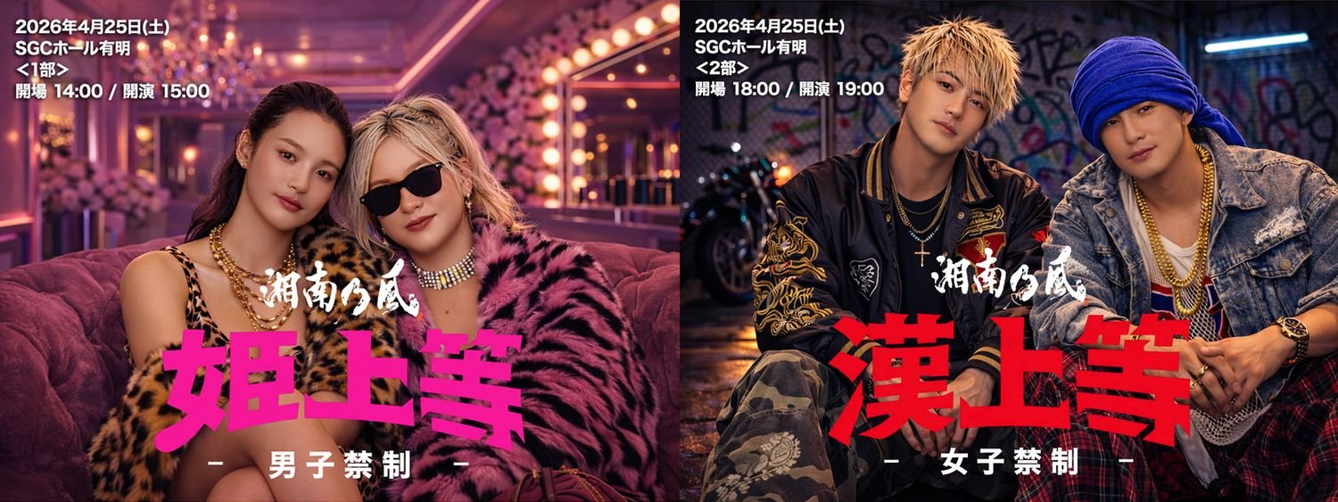 今回は、湘南乃風史上初めてとなる男女限定公演を開催することが決定。1部・「姫上等~男子禁制~」は女性限定公演、2部・「漢上等~女子禁制~」は男性限定公演となる。オフィシャルファンクラブ「風乃軍団」最速先行がスタート!