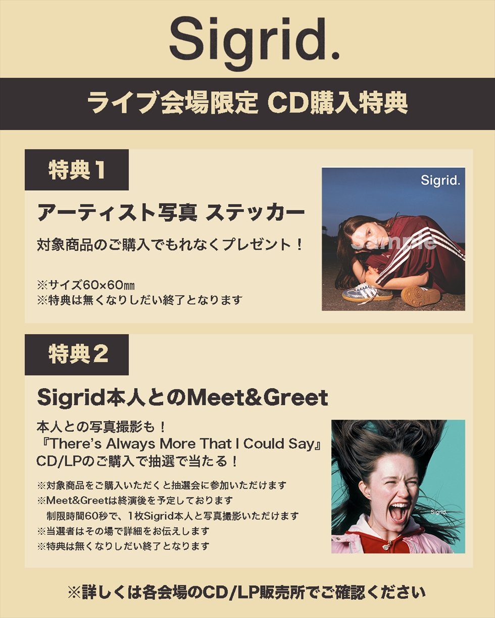 会場でSigridのフィジカル商品を購入すると、先着で限定アー写ステッカーをプレゼント!さらに本人とのMeet&Greet抽選会にご参加頂けます。