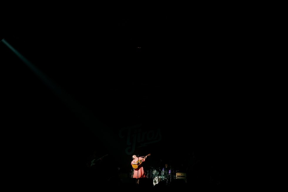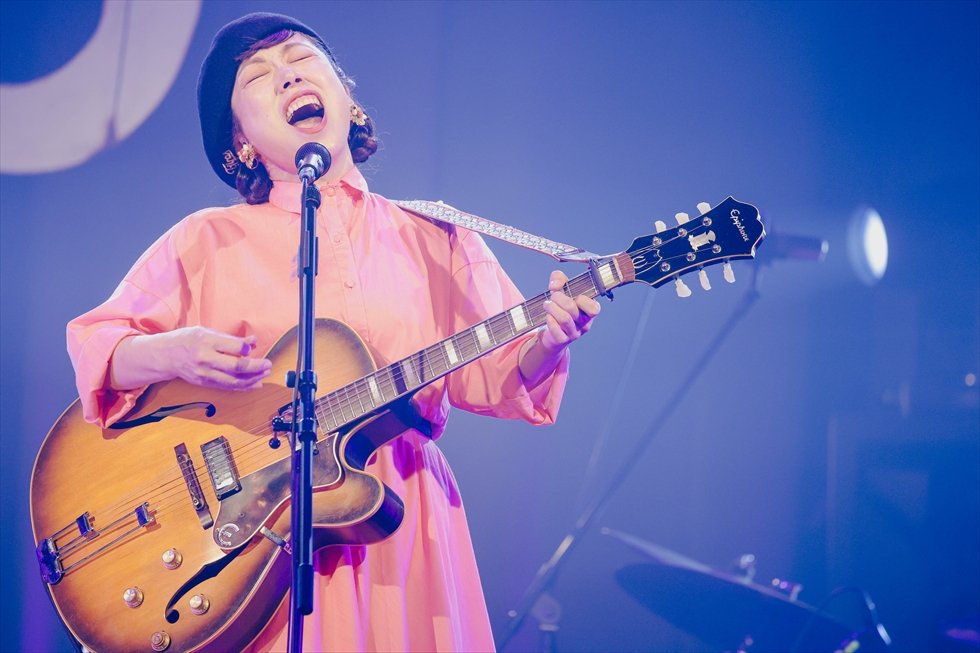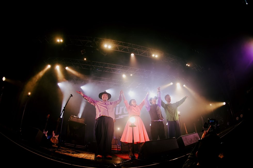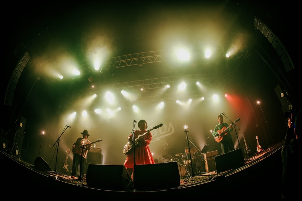 1曲目の「その日暮らし」から、伊東妙子(Vo. & Gt.)と篠田智仁(Ba.)による、いつも通りの2人編成で4曲を披露。会場の空気が十分に温まったところで、「お待たせいたしました。マジックトラベリングバンドをお呼びしたいと思います!」と伊東が呼び込むと、長岡亮介(Gt.)、坂田学(Dr.)が登場し、バンド編成での演奏がスタートした。