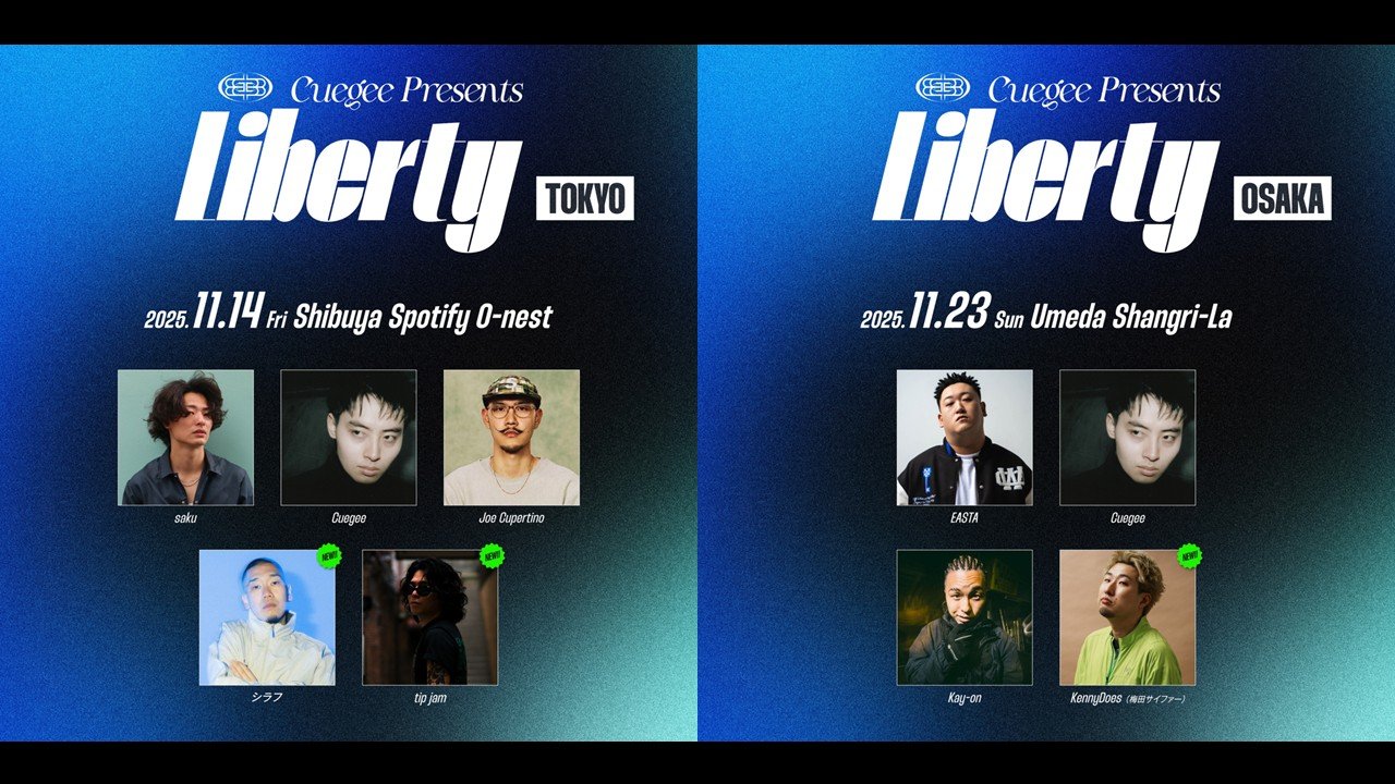 そんな松村和哉がソロ名義 Cuegee として11月14日(金)Spotify O-nest、11月23日(日)梅田Shangri-Laにて開催する初主催イベント「Liberty」に、シラフ・tip jam (東京)、KennyDoes(梅田サイファー) (大阪)の出演が決定した。