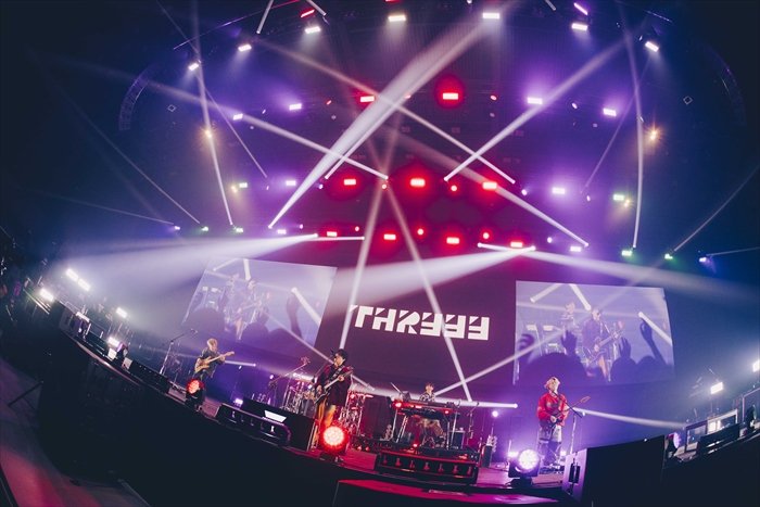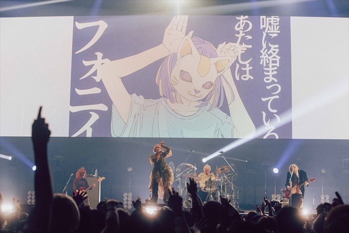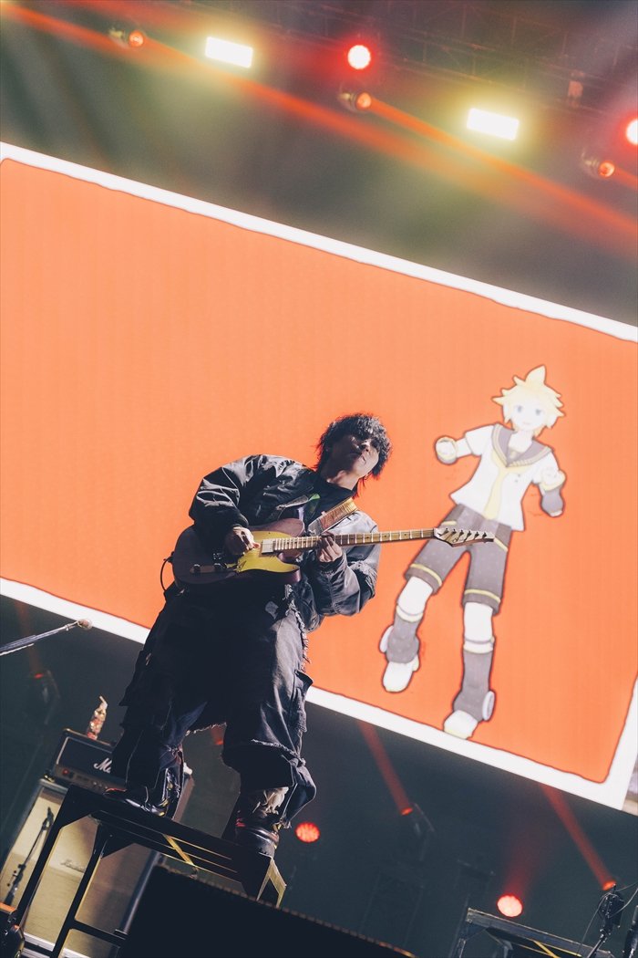 重厚なSEと共に4人がステージに姿を現すと「ドリーマーズのテーマ」のセッションがスタート。syudouがドラム、ツミキがベース、Ayaseがキーボード、すりぃがギターと、4人が一列に並ぶバンド編成だ。「DREAMERS、始めるぜ!」とsyudouが告げ、まずはツミキ作曲の「アングレイデイズ」を披露。ステージ背後の巨大LEDビジョンには鏡音リンの歌唱する姿が映し出され、バーチャルな歌声と生身のバンドサウンドが混じり合う。