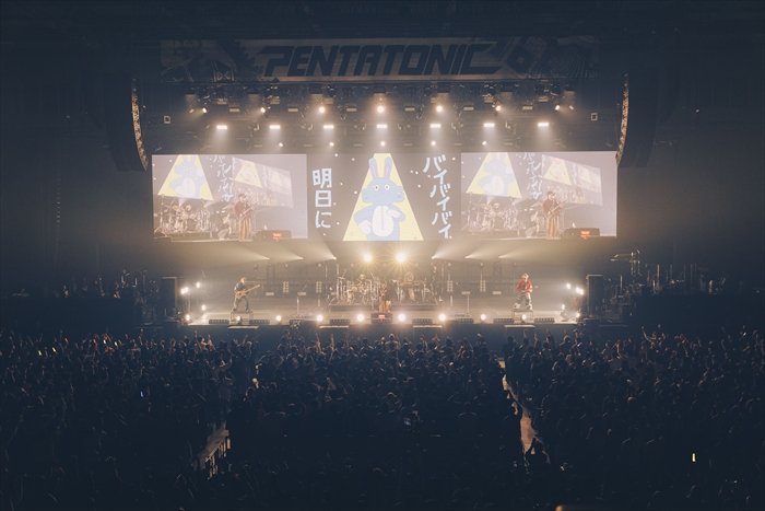 「今日は一日楽しんでいきましょう!」と告げたすりぃ作曲による、鏡音レンが歌う「テレキャスタービーボーイ」へ。疾走感あふれるダンスロックにフロアが沸き立つ。ラストの「ビターチョコデコレーション」ではパワフルなバンドサウンドの上で初音ミクがダークでシニカルなメロディを歌う。演奏を終え、4人は肩を組んでステージ中央へ。「それではPENTATONIC始まります!」と高らかに宣言し、オープニングアクトとしての役割を完璧に全うしてバトンを繋いだ。
