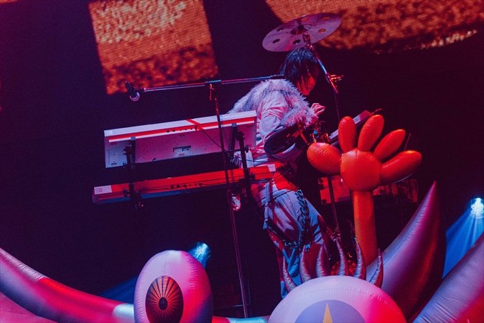 ステージに巨大なオブジェが運び込まれ、バンドメンバーとともにikura、Ayaseが姿を現すと、会場のムードが一変した。先ほどはDREAMERSの一員としてキーボードを弾いていたAyaseが、今度はYOASOBIとして登場。「ぶち上げていけますか!」というikuraの声を合図に「アイドル」が炸裂すると、フロアは沸騰。「オイ! オイ!」のコールが飛び交う中、続けざまに「祝福」、「UNDEAD」とハイテンションなキラーチューンを連射。冒頭からトップスピードで駆け抜け、会場のボルテージを天井知らずに引き上げていく。
